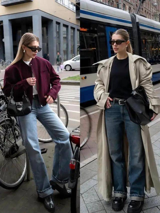或是选择圆头乐福鞋,配上牛仔直筒裤和卡其色风衣外套,呈现效果又飒又美又拉风,所在的城市气温稍低,可选这种厚底的乐福鞋。