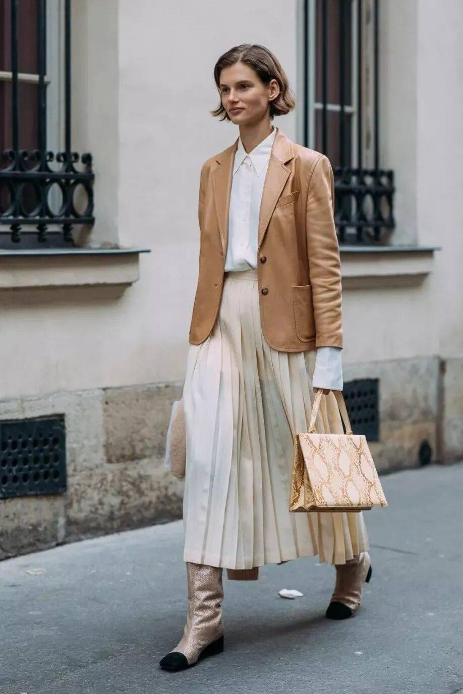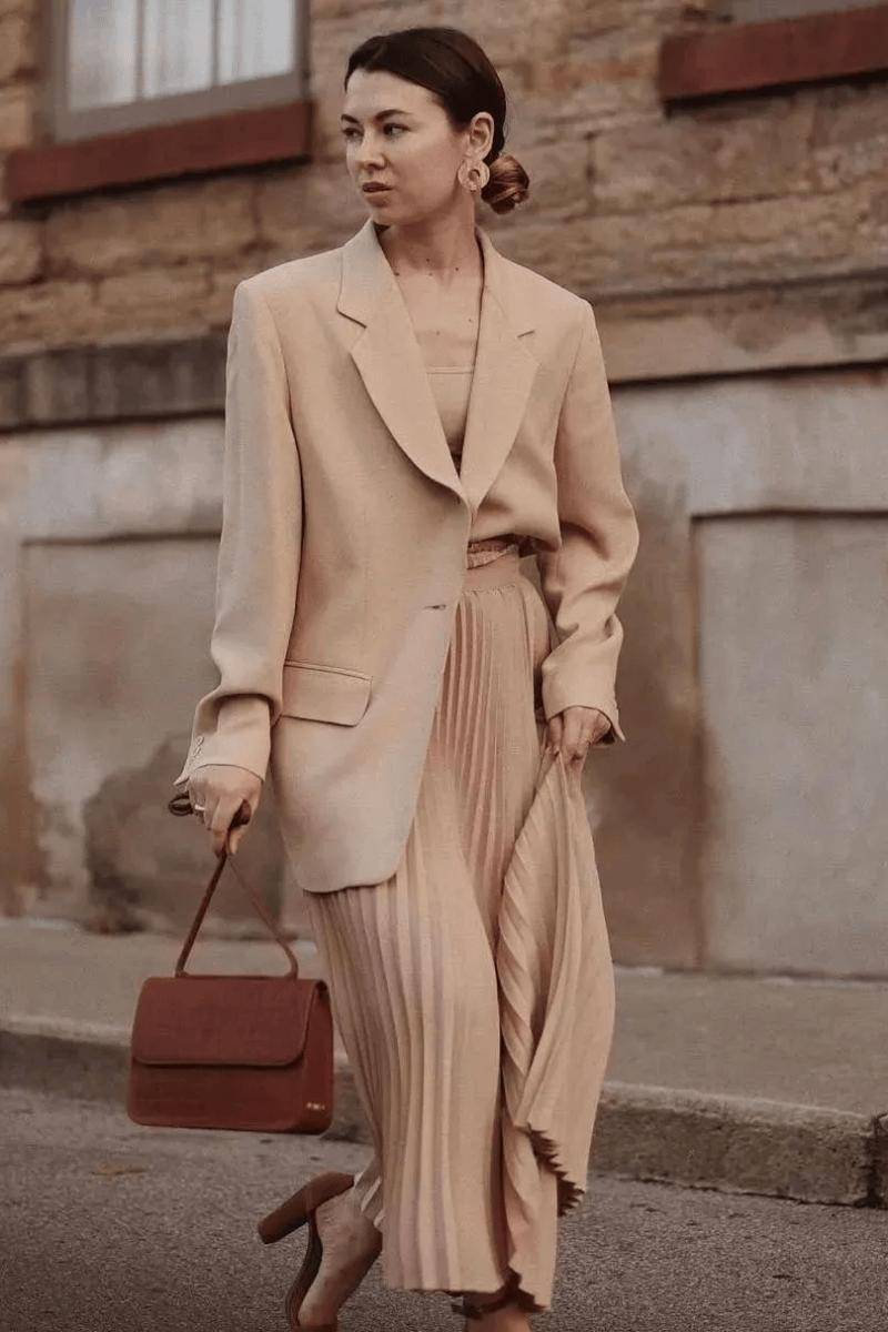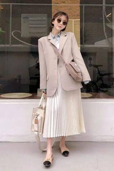 基础款百褶裙:百褶裙的褶皱元素自带时髦吸引力,日常穿搭中,即使是很寻常的基础款也足以让你稳赢。与西装同色系搭配,大气耐看又很有细节感,不用担心单调。