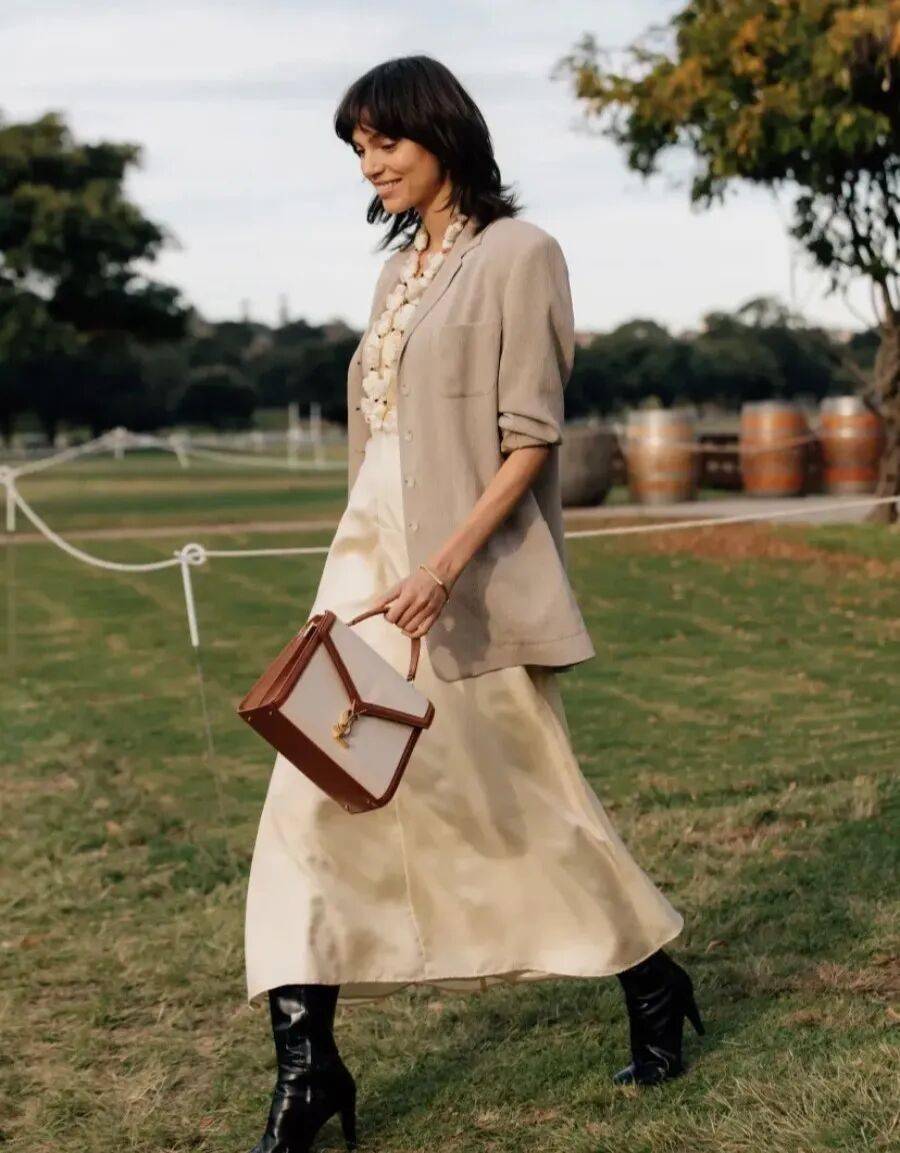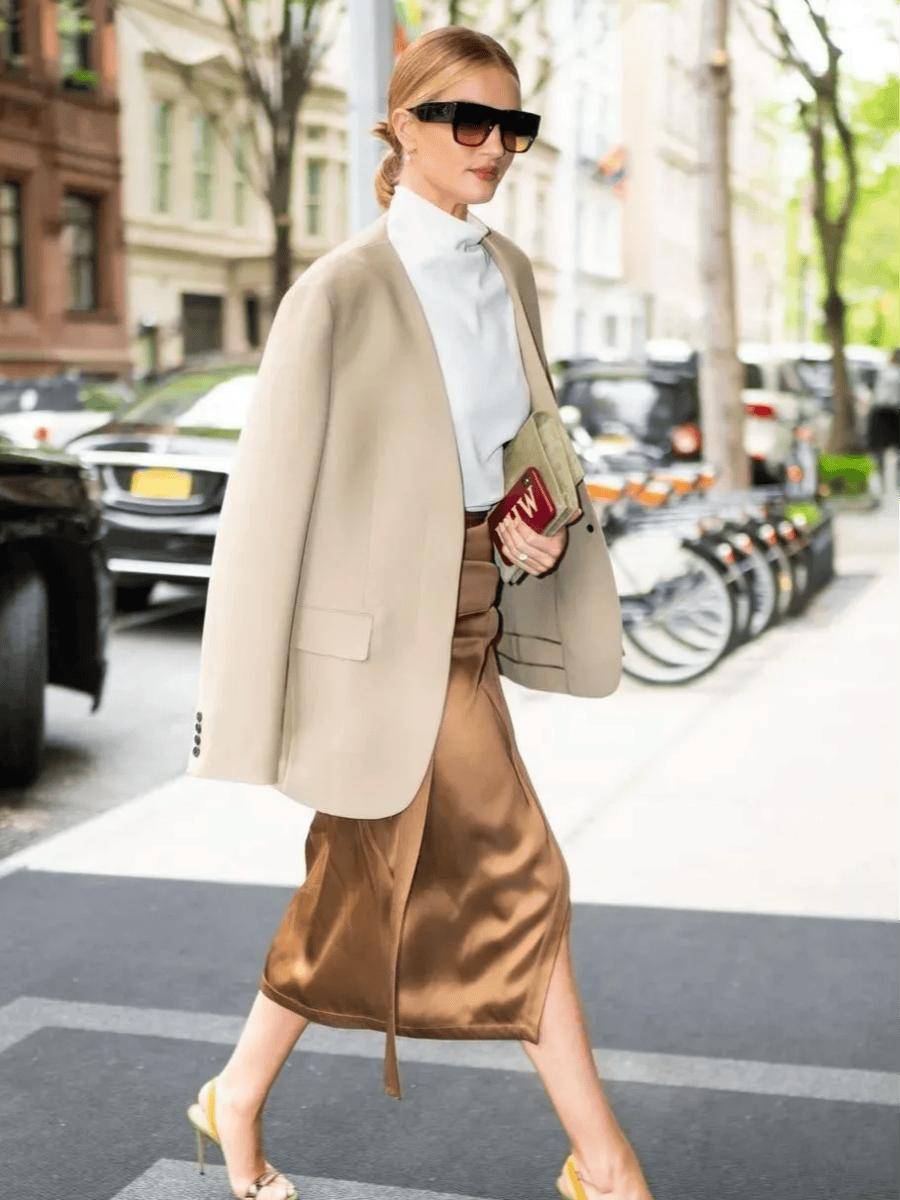 缎面裙以其独有的光泽感,为西装造型打造出低调的奢华感。无需夺目抢眼的元素图案,举手投足间便能展现出优雅与女人味。缎面裙的丝滑质感独特,非常适合与西装外套打造同色系搭配,整体造型相呼应又不失层次,彰显不俗穿搭功力。