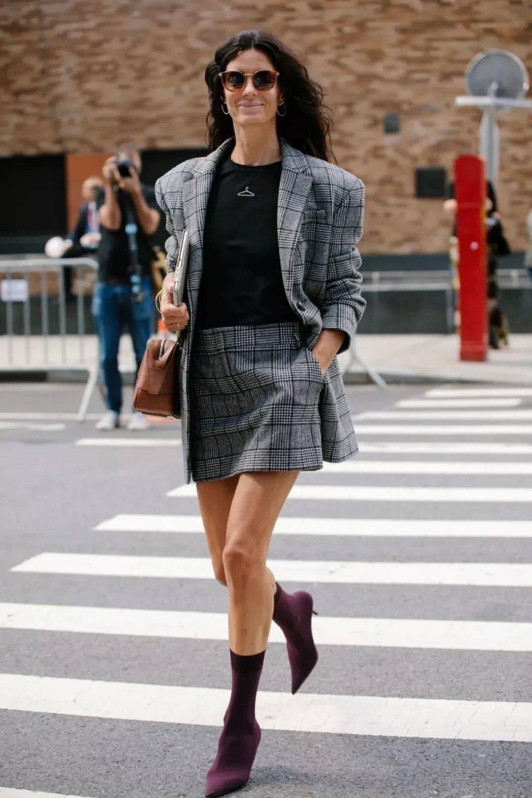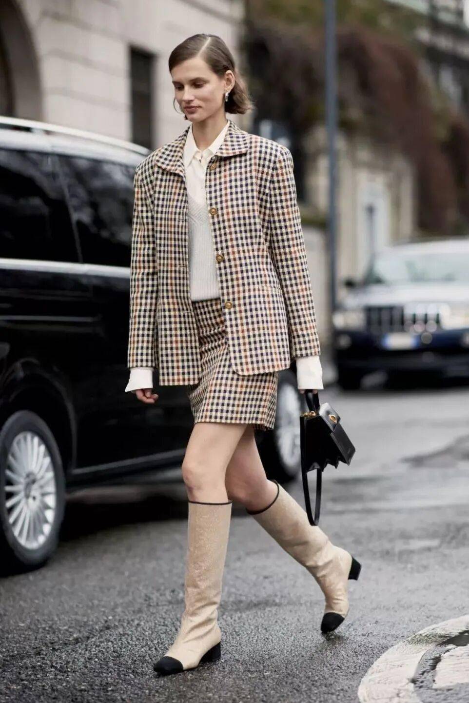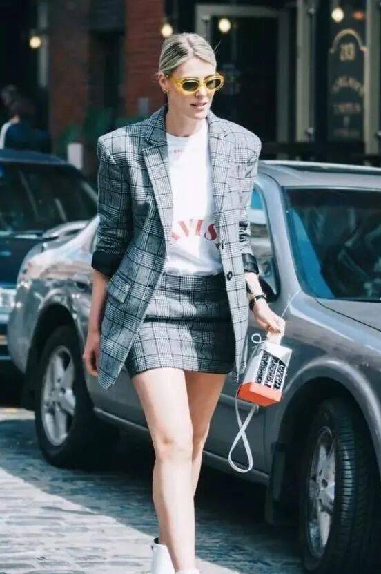 格纹裙与西装:格纹裙与西装的组合在潮人穿搭中出镜率极高。两款vintage感十足的单品叠穿,与时下流行的复古风相呼应,气质爆棚。