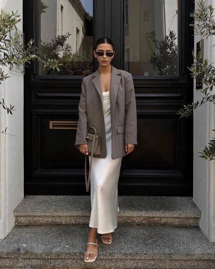 浅色调缎面裙:颜色更清淡的浅色调缎面裙则更能突显温婉韵味,与西装外套搭在一起,气质优雅迷人。