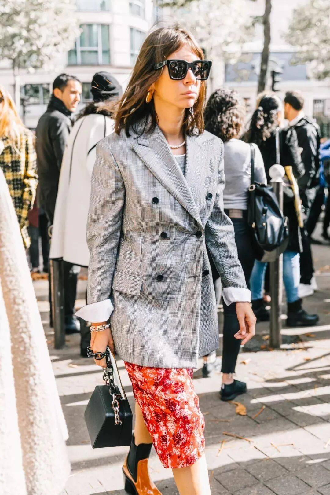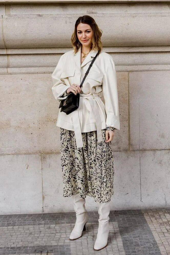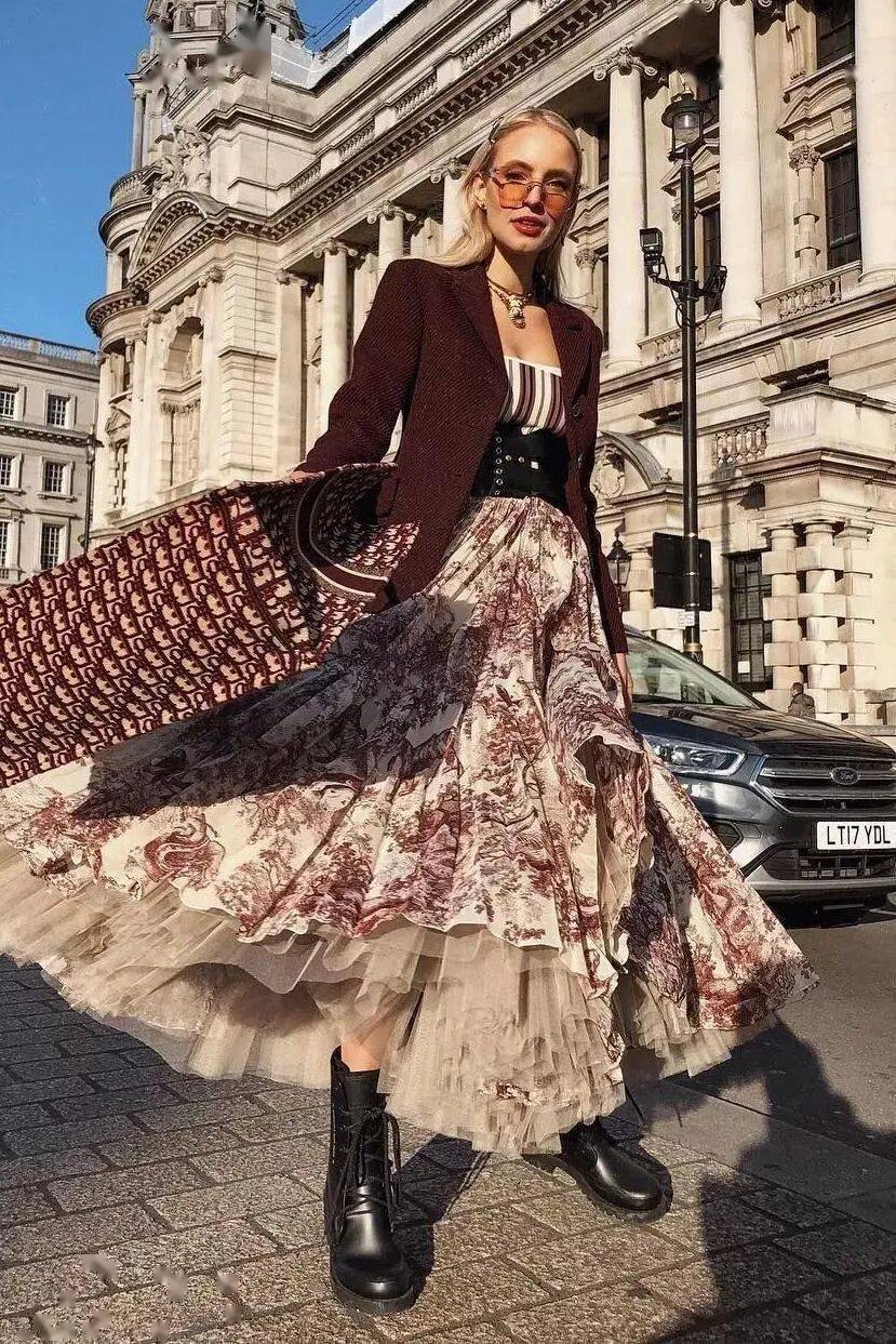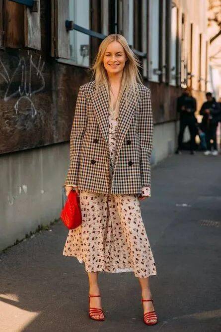 一、西装 + 印花裙:养眼浪漫的春日序曲