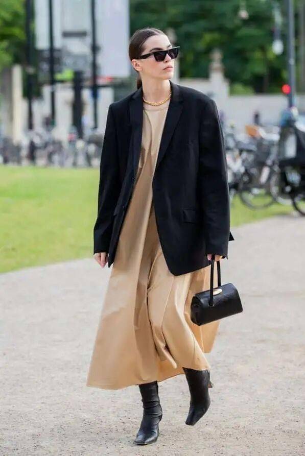 黑色缎面裙:黑色缎面裙显瘦百搭,中性黑色为造型增添了几分飒气,与西装外套搭配,既帅且美。