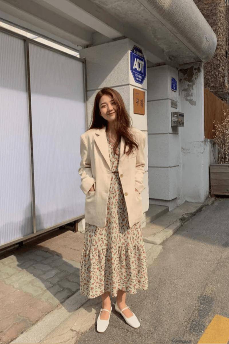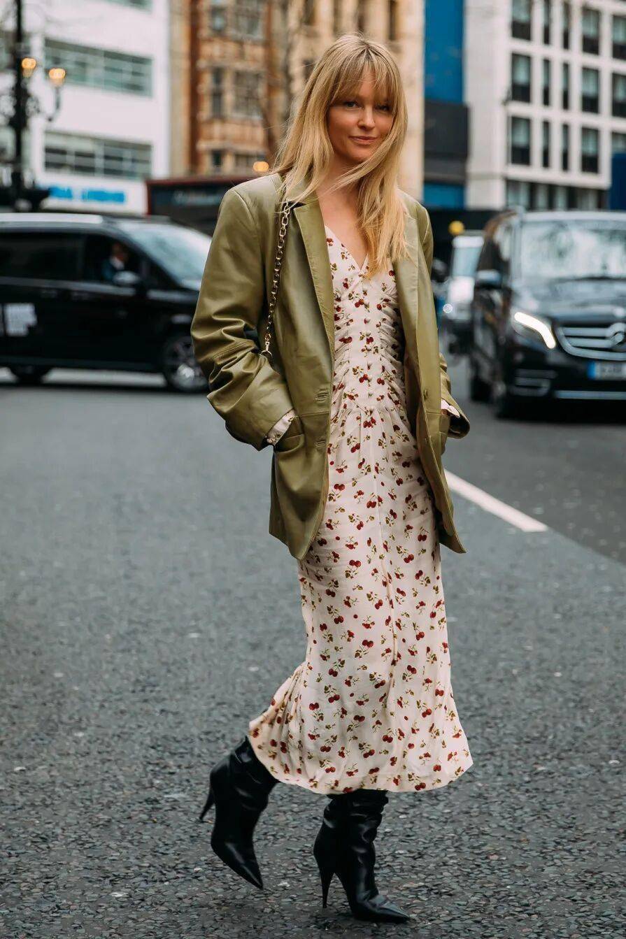1. 印花裙与西装的完美邂逅