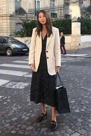 鲜艳印花裙:若印花裙款式比较鲜艳,建议搭配极简款经典色西装,遵循“一繁一简相中和”的经典套路,提升造型质感。例如,波点印花裙与西装的组合,能轻松打造法式复古风,慵懒文艺又不失浪漫。