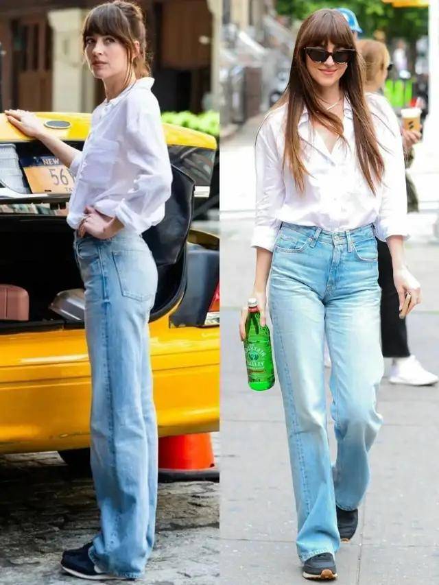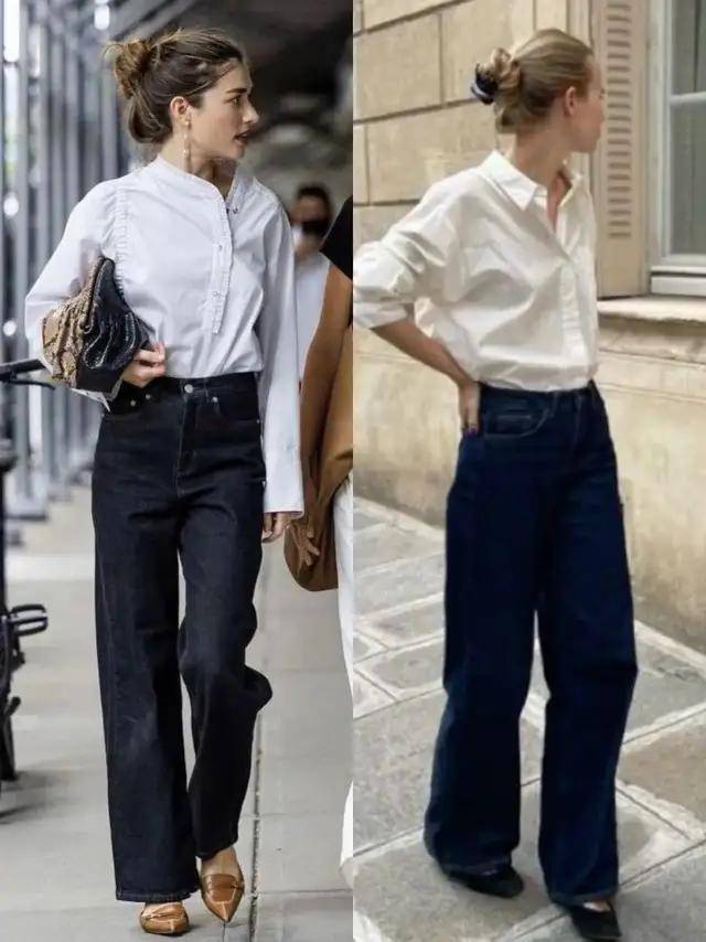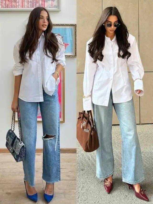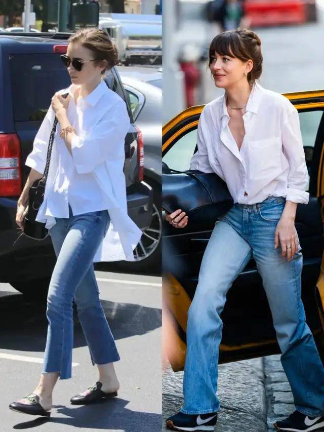 浅蓝色与深蓝色的牛仔裤搭配上白色衬衫,气质截然不同。就像上面用白色衬衫配上深蓝色的牛仔直筒裤,脚踩一双大地色系的尖头浅口单鞋,干练利落,沉稳又耐看。