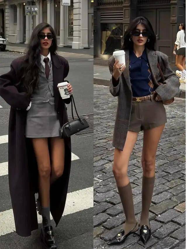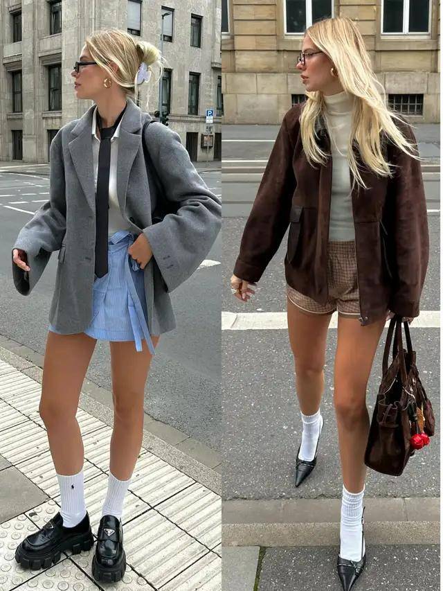 短裤的面料、版型、色彩不同,穿出来的质感有着天然的区别。像上面灰色的短裤,配上棕色的短大衣,脚踩黑色厚底皮鞋,不光高级还很飒爽。