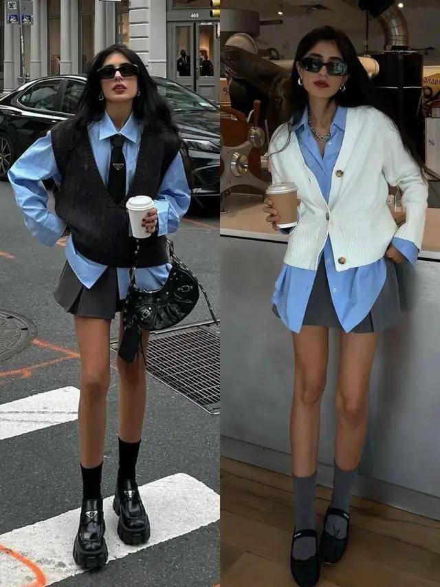 或是换成灰色大 V 领针织背心,叠穿蓝色衬衫与灰色压褶短裙,脚踩圆头皮鞋,再系上一条小领带,少年感与少女感兼具。