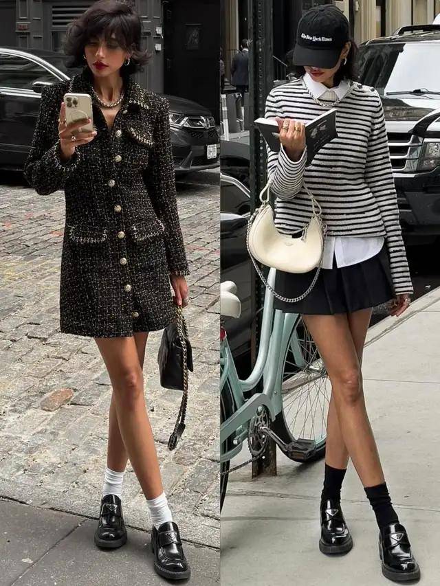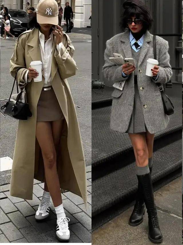 鞋子一换,整个人的气质便立刻完全不同。同样是短裙配西装外套或灰色大衣,换上一双黑色中筒靴,飒爽感瞬间直接拉满。