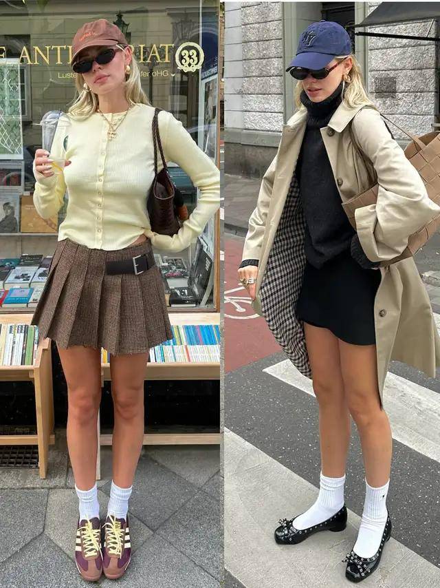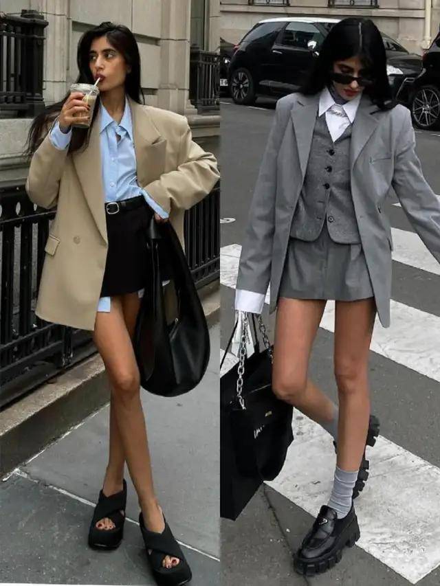 或是换成黑色短裙配蓝色衬衫和卡其色西装外套,脚踩黑色中筒靴,这种“下衣失踪穿法”更显活力。通勤日常都适配,简约却超有格调。