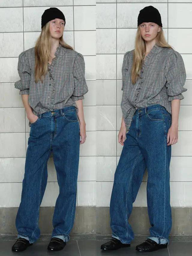 偏爱慵懒小众穿搭的风格,不妨试一试格纹木耳边衬衫,搭配低腰牛仔直筒阔腿裤,脚踩黑色皮鞋,头戴黑色针织帽,简约随性,自带慵懒气场,干练又精致,又带了那么一点点小叛逆感的时尚气息。