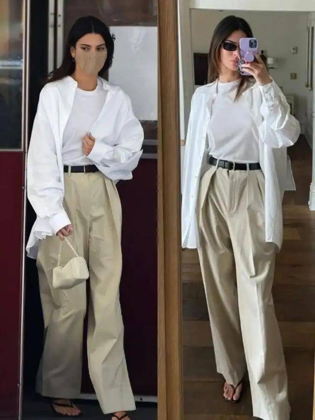 若是偏爱通勤风,可选经典卡其色西装直筒阔腿裤,内搭白 T 恤,穿时把 T 恤衣角塞进裤腰,勒上黑色腰带,腰线立刻清晰,身材变成三七分。外披白色衬衫,慵懒随性。