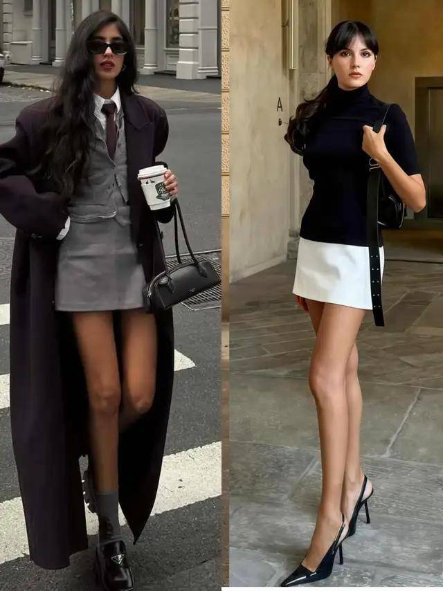 一身灰色西服裙装,内搭灰色背心针织与衬衫,脚踩黑色皮鞋。整体色彩简约又大气。或是卡其色西服叠穿蓝色衬衫,配上黑色短裙,干净利落。