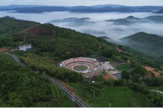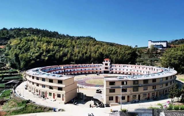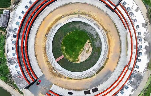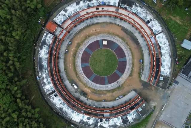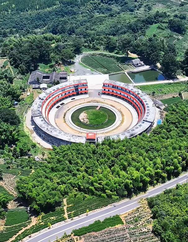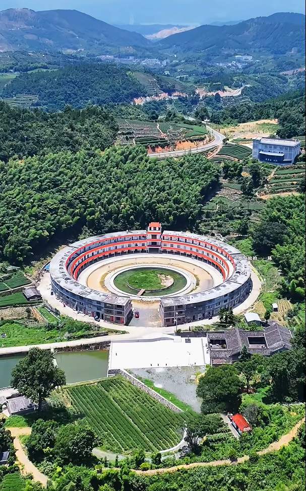远远望去,这座圆楼外观红白相间,既有传统土楼那种“天圆地方”的韵味,又透着现代化的设计感。