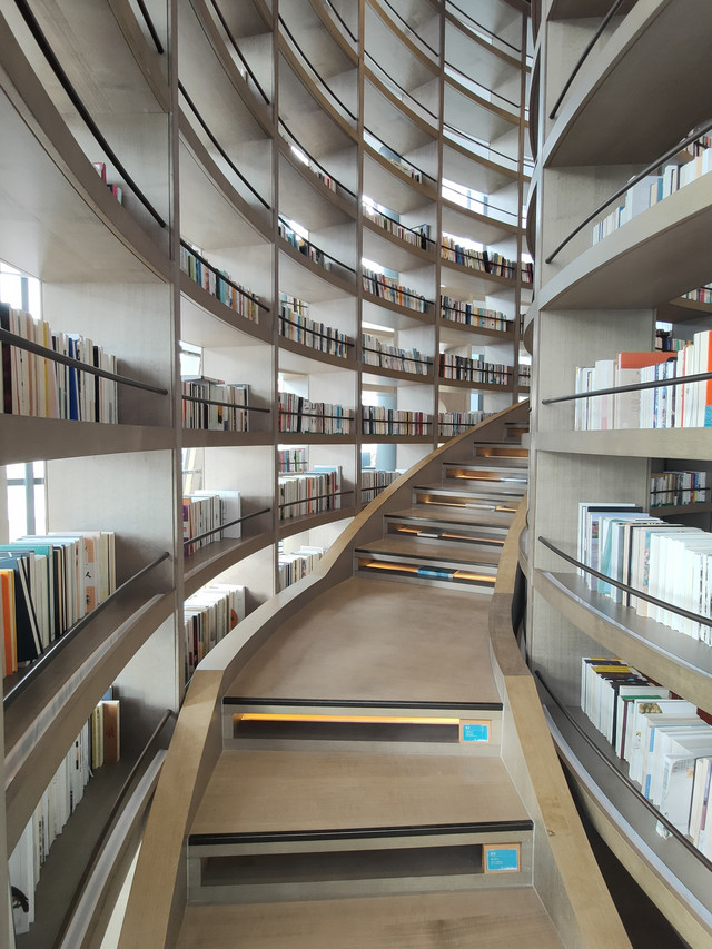 爱上书吧在三楼,一进门就能看到高达6米的圆筒形书架,上边密密麻麻地摆满了25000多册书籍,交错间穿插着几个精致舒适的卡座,走入其中,感觉置身于书的海洋,顿时有种被书包围的感觉。圆筒环型书架之间是旋转而上的楼梯,引领读者穿越书海,一路向上。