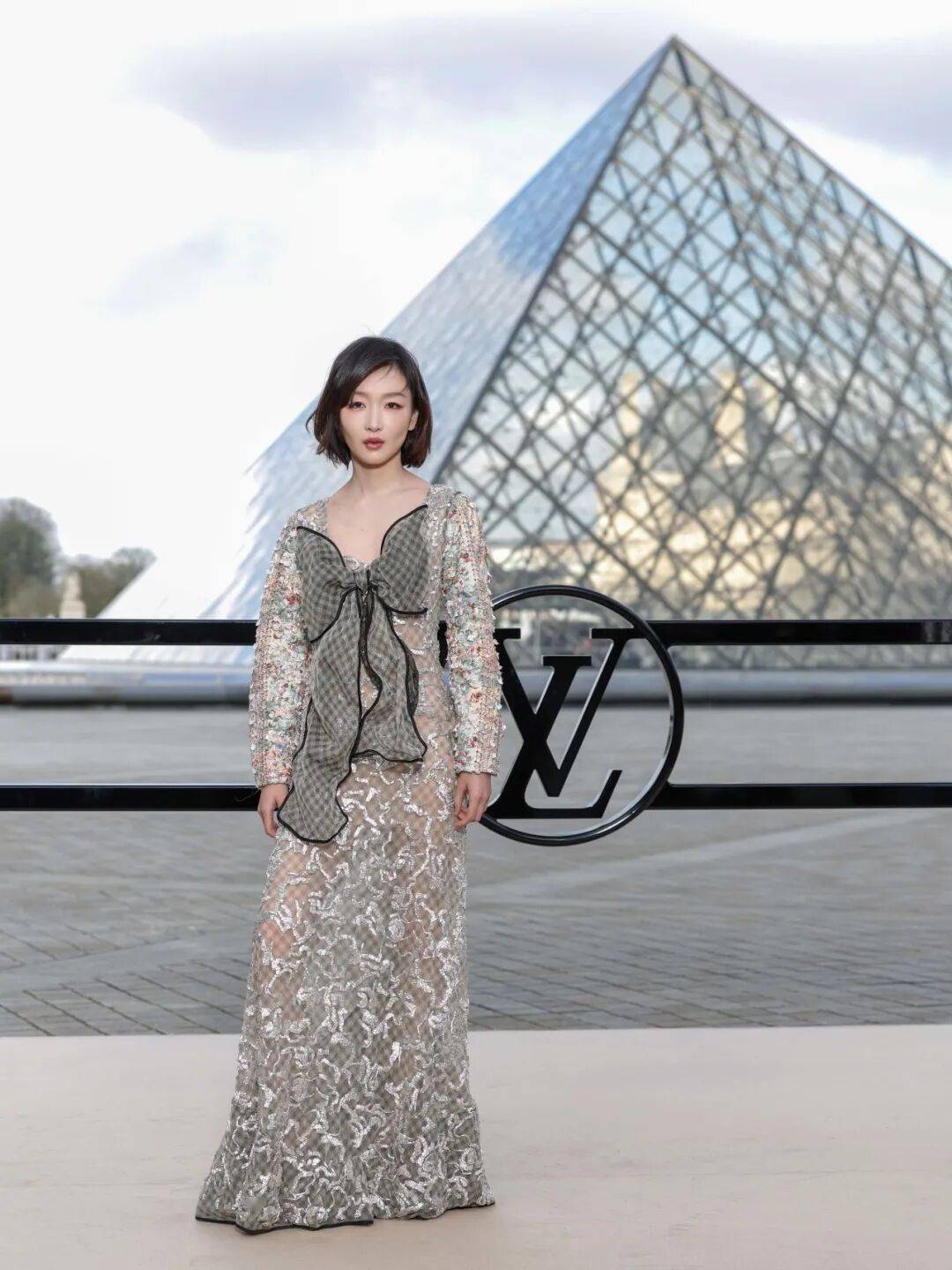 数字艺术介入现实:模特走过卢浮宫广场时,衣摆印花与投影的光影瀑布交融,打造虚实交织的“数字自然”幻境。