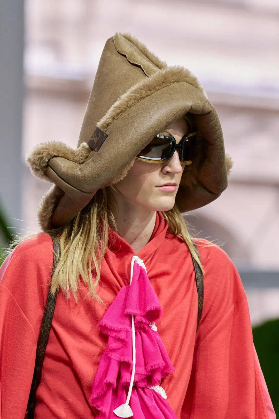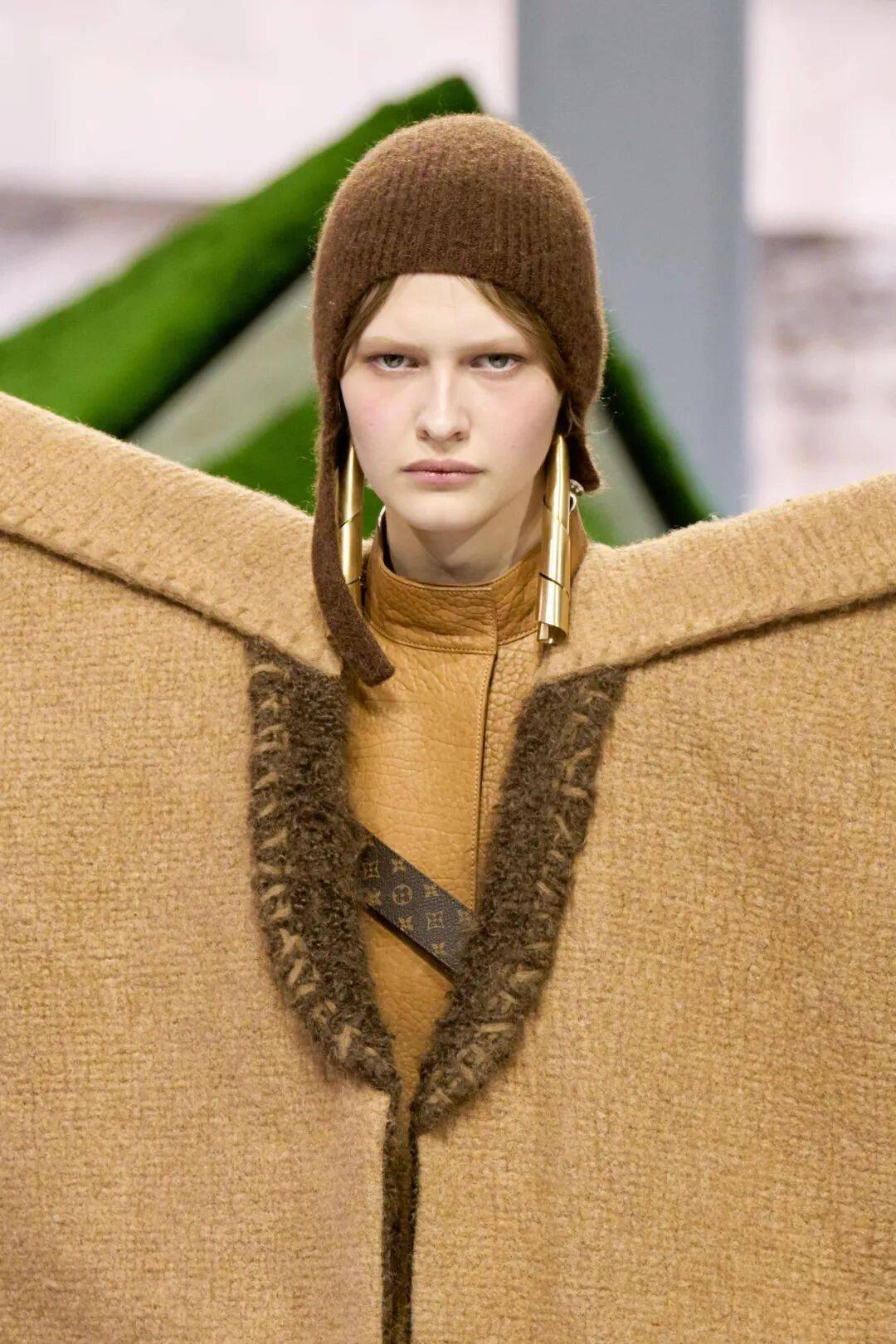 皮革在本季成衣中呈现了不少有趣细节,纽扣、不规则的编织、肩头或胸前的花朵、联结衣服各部分的夸张缝线等,展现出全新质感的细节肌理。对于逐水草而居的族群而言,皮革不仅是材料,更是他们包裹生命、记录迁徙的载体。当皮革被转化为时装细节时,仿佛把「行走的世界」穿在了身上,同时也体现了路易威登深入灵魂的品牌精神——精湛的制箱与皮革工艺。