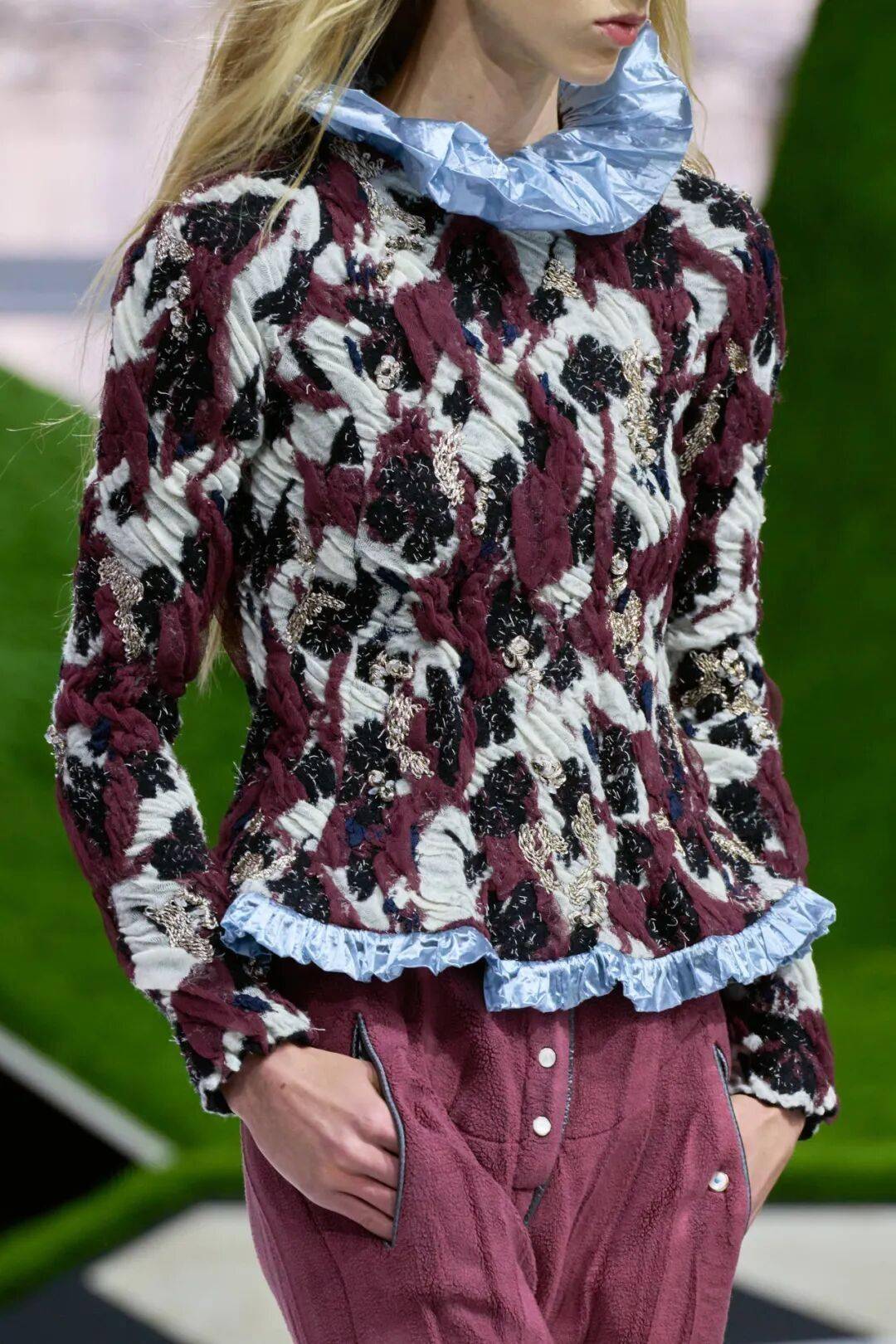 生动的裤装下摆像溪水蜿蜒和植物柔软的姿态,腰部收束与释放的设计,模仿着树木在生长过程中的节律。这种将自然形态融入时装设计的手法,让服装仿佛有了生命,与穿着者产生共鸣,展现出自然与人类的和谐共生。