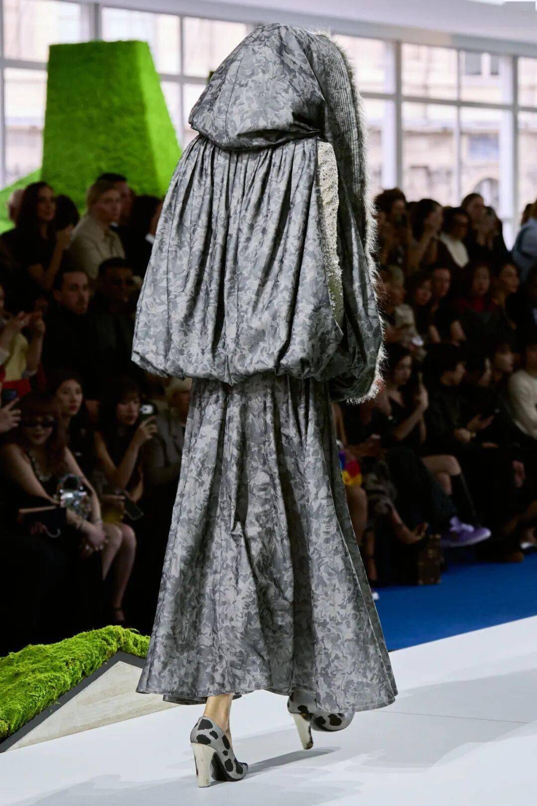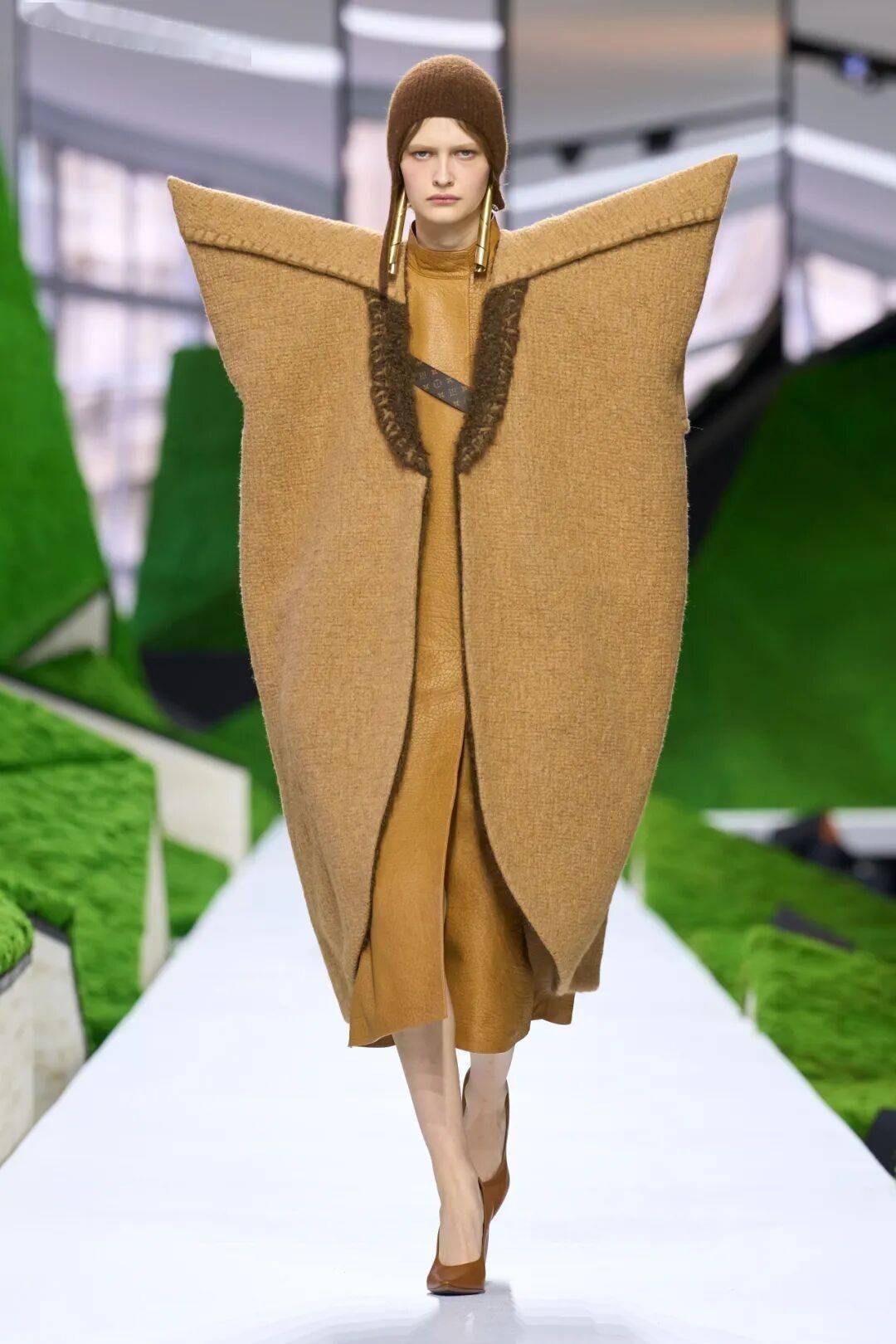 在2026秋冬女装秀上,Jeremy Hindle以卢浮宫为舞台,构建出“悬浮的数字山丘”与“光影苔原”,让19世纪廊柱环绕未来地貌,完成一次时空交叠的自然对话。