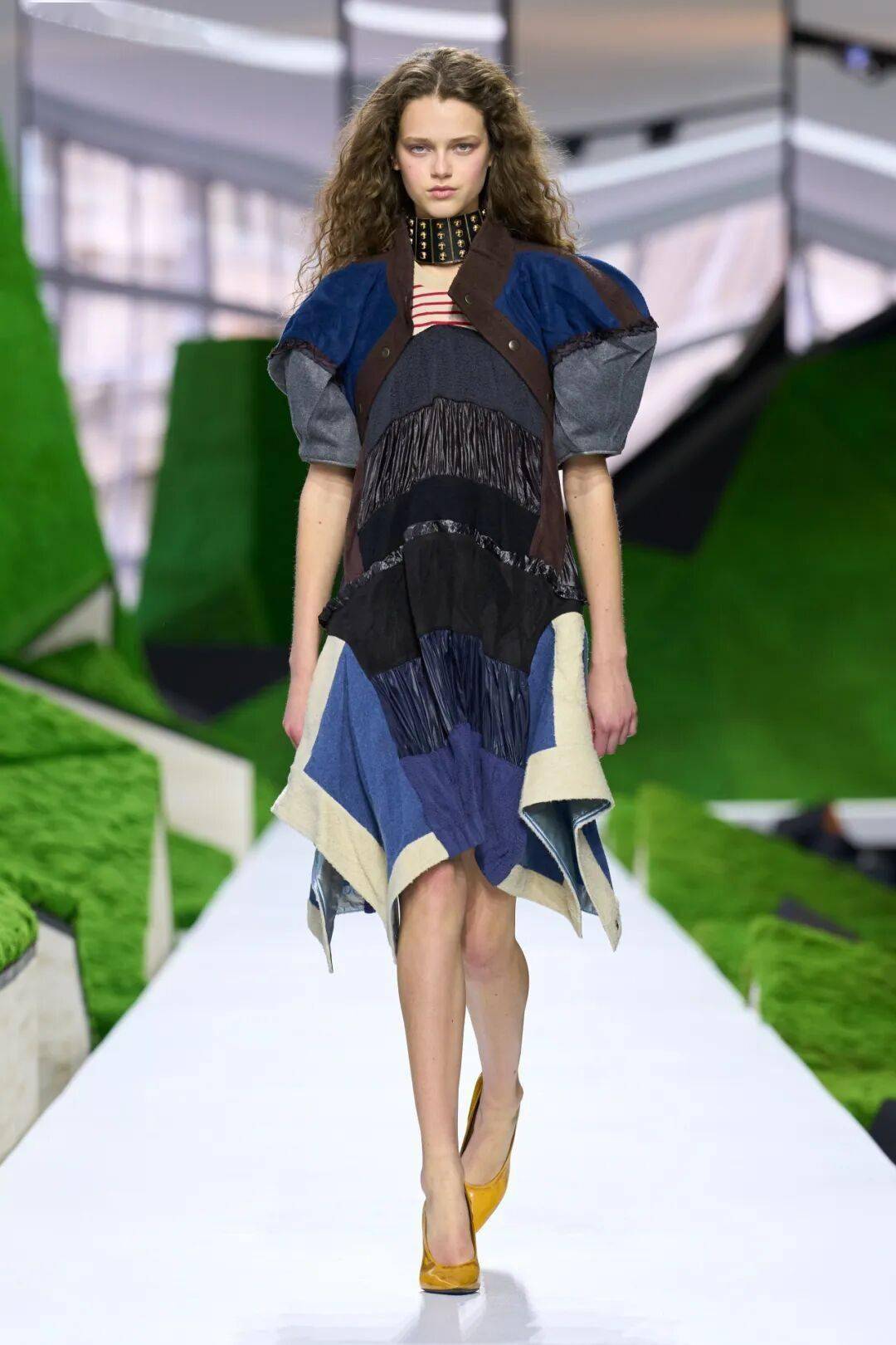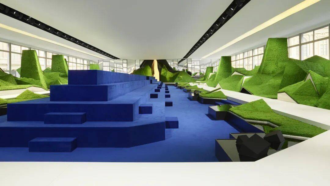 布景设计师Jeremy Hindle为本次大秀在卢浮宫内搭建起一座超现实的“山峦”,以抽象笔法重塑自然。秀场被布置成几何形状的春日山野,T台是深邃的蓝色背景。