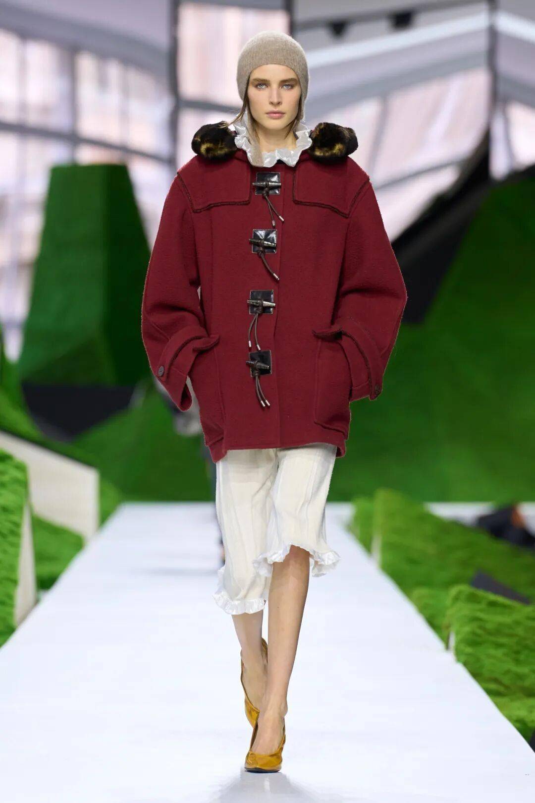 缀以羊皮毛滚边的Malakhai帽和带有护耳设计的羊毛冷帽,吸睛又温暖,为整体造型增添了一份俏皮与可爱。藤编竹篮以装饰形式出现在秀场,让人回想起儿时嬉戏的时光,唤起人们对纯真岁月的怀念。本季的细节十分值得玩味,由3D打印制造出的纽扣、鞋跟,前者仿佛河道中历经洗练的矿石,后者像是充满力量的鹿角,以另一种形式在现代都市中实现了对自然的转译。