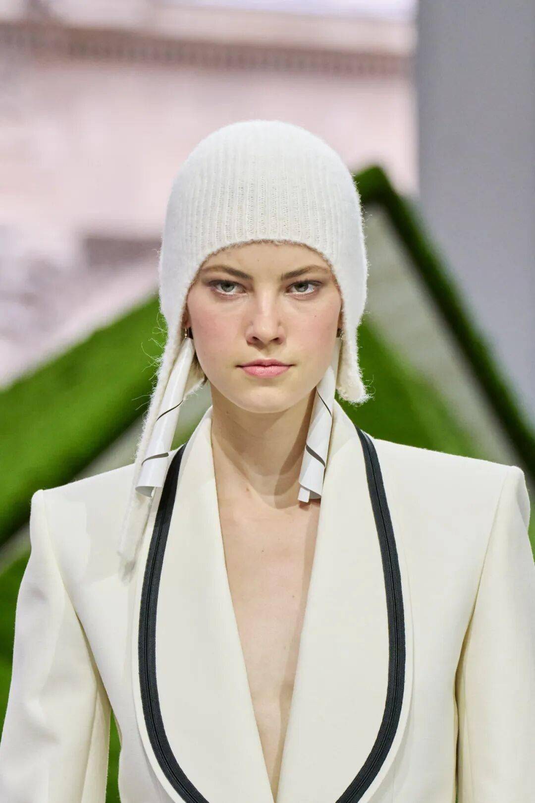 大秀开始的几件廓形外套拥有极具建筑感的线条,从肩线的起伏中,人们能感受到远山轮廓的想象。在当今时代,这种设计不仅是时尚的表达,更是一种富有力量的时装语言,展现出女性坚韧与自信的一面。