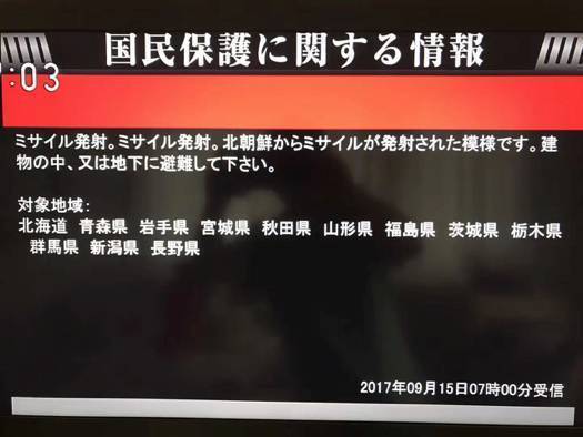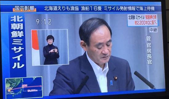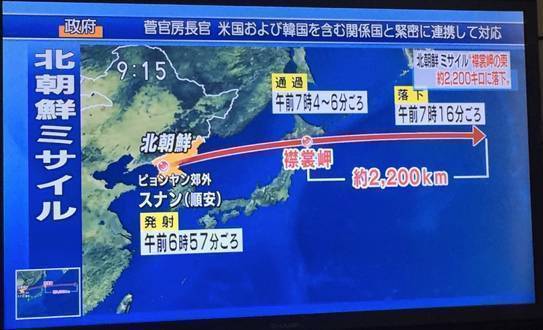 日本NHK电视台报道称,朝鲜发射的导弹坠入北海道襟裳岬以东2200公里的太平洋海域,日本政府通过“全国瞬时警报系统”向日本东北部12县发出了警报。韩国通过韩联社宣布,韩军向半岛东部海域发射一枚“玄武-2”弹道导弹。