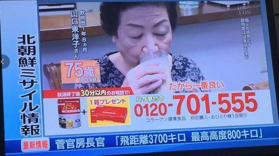 不过,有日本媒体在报道中提到,日本民众对朝鲜频繁发射导弹“已经习惯了”,今晨这次并未引发骚乱。 电视台貌似也没受影响,继续播着胶原蛋白的饮品广告…… 一向爱小题大做的日本,为何能如此淡定?
