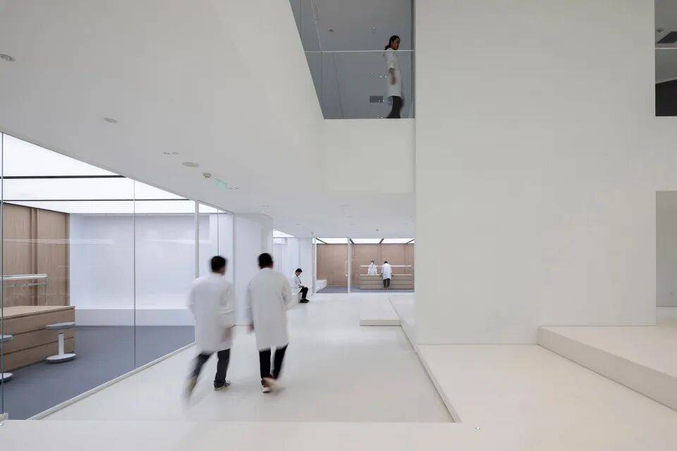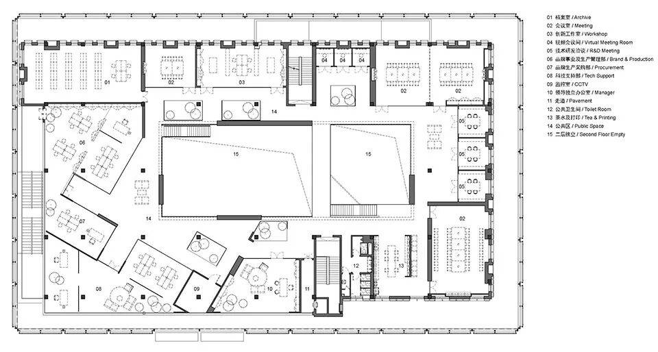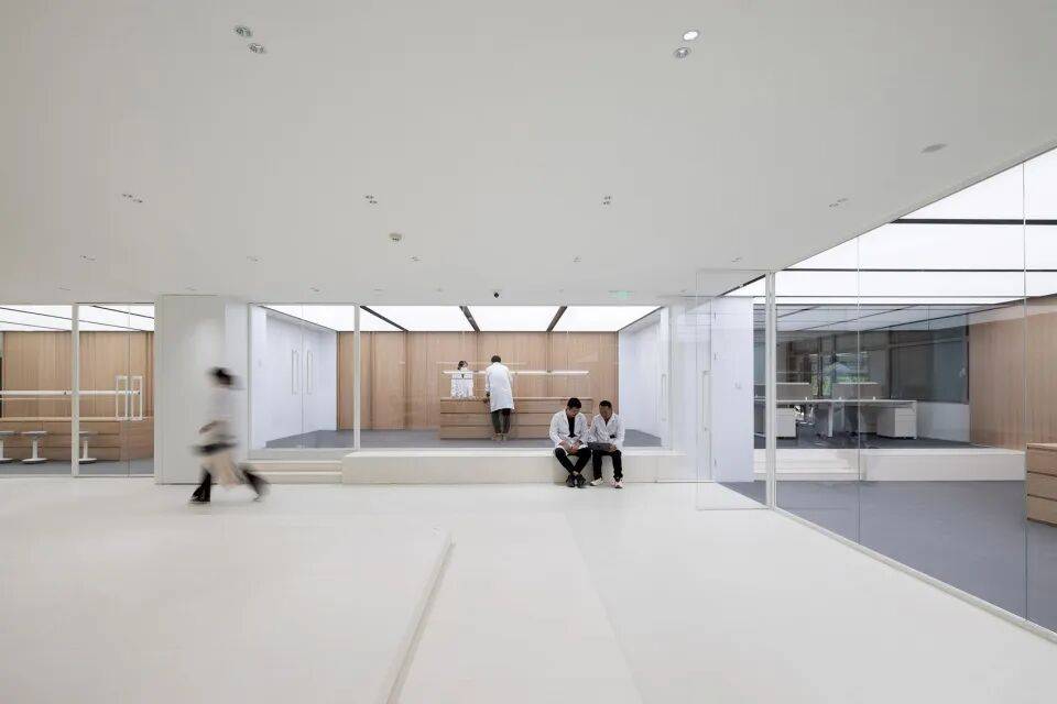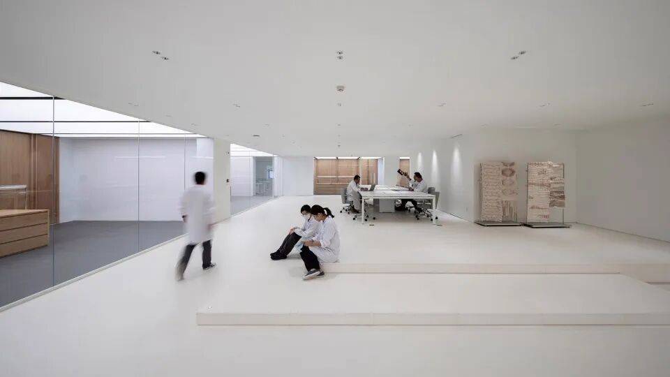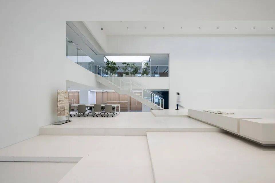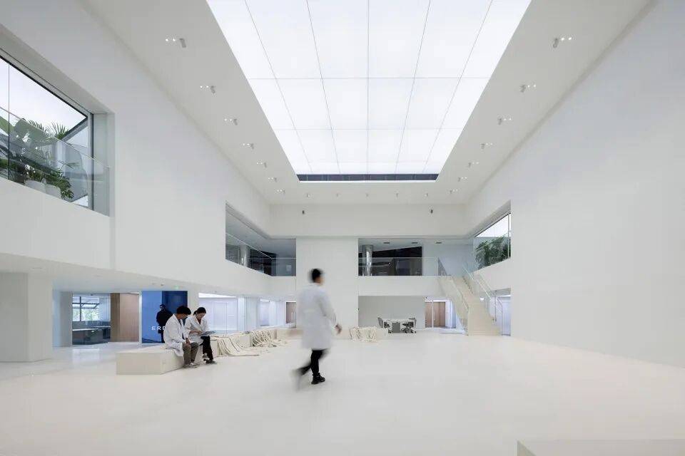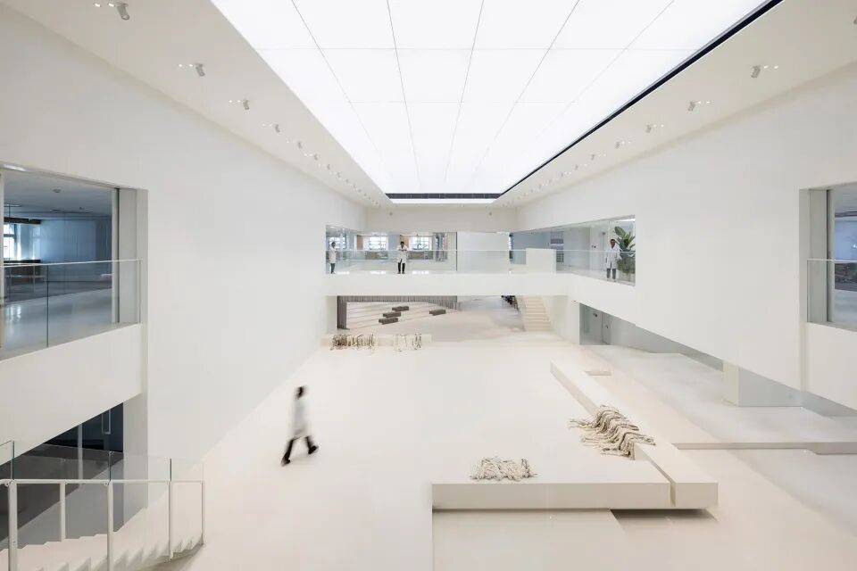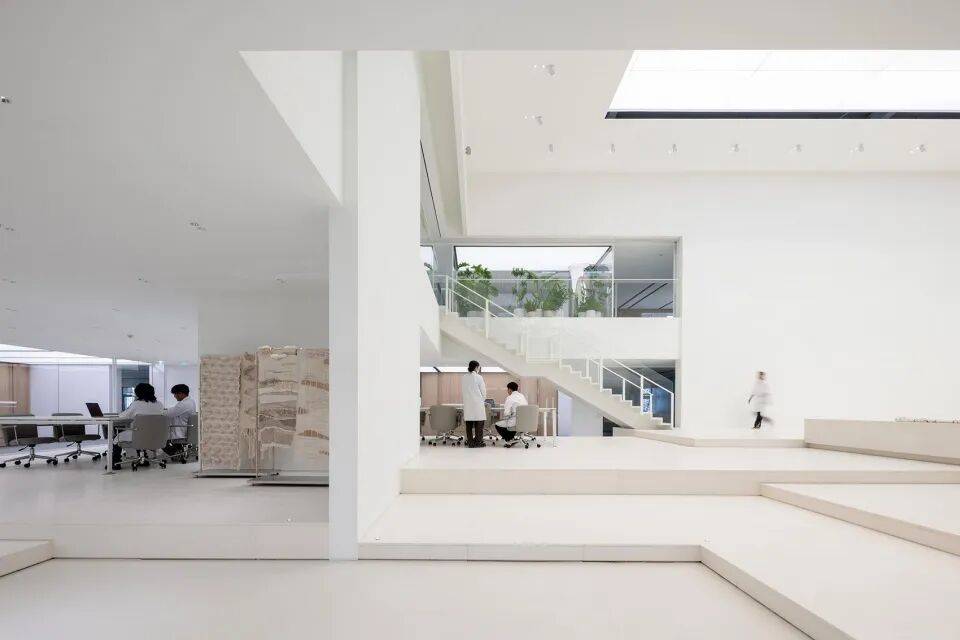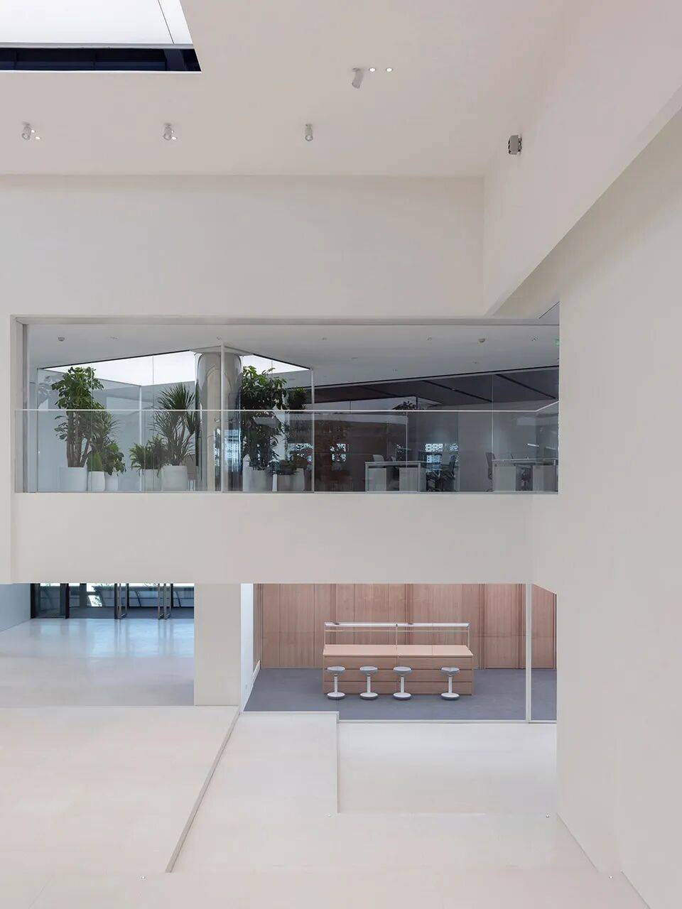 ▲中庭空间© whyseeimage 原建筑采用封闭的”回字形”布局。在改造中,我们部分保留了这个特征,同时围绕中央庭院旋转并打开了多个区域。研发工作室、技术研究室、研发区域和样品库等关键功能空间被重新组织。我们用种植绿植的玻璃盒子在网格系统中旋转45度,这一设计打破了传统的正交环路,创造出丰富的次级路径,让三层空间的流动更加自由。由此,各工作区之间的界限变得模糊,人们在流动的空间中获得了更多相遇和交流的机会。