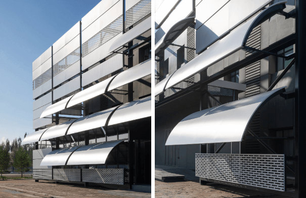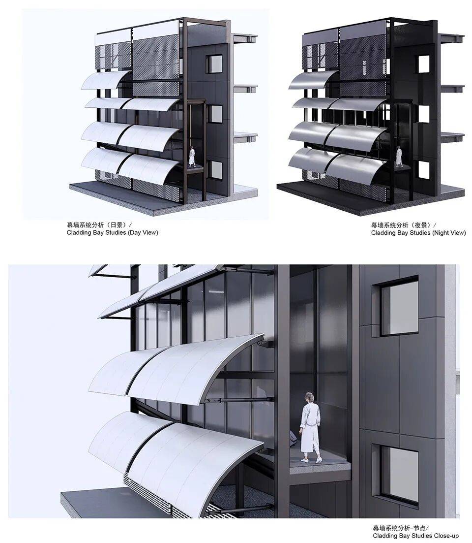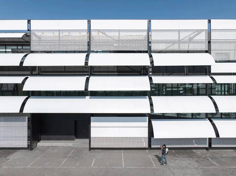 ▲模块构件化的立面系统© whyseeimage 立面的三大元素设计: 1. 采用1.5米×5.8米的标准化模块重新划分建筑尺度,通过修长的面板线条在视觉上减轻了建筑的体量感 2. 精心布置的穿孔铝板在保持立面完整性的同时,确保了室内外的视觉连通 3. 弧形铝板根据内部空间视野需求和主要流线走向进行精准定位,引导着人们在空间中的移动