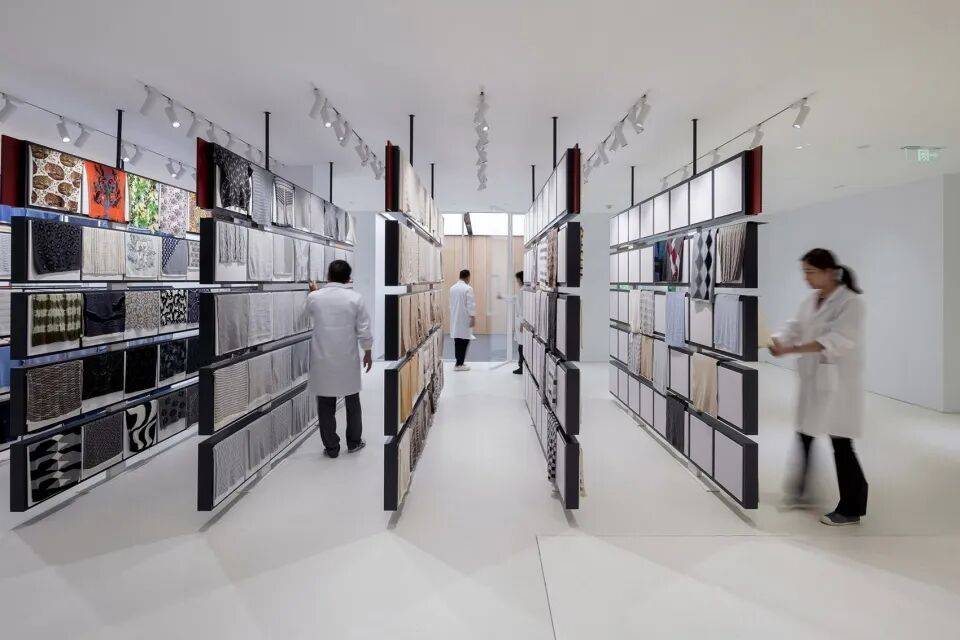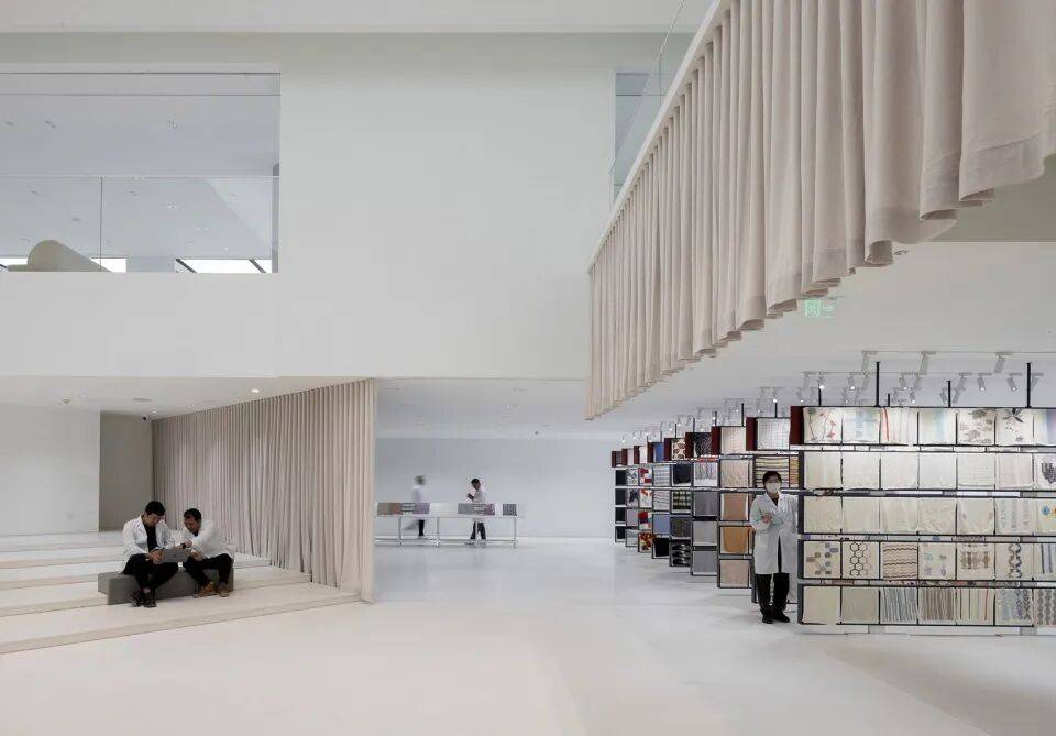 ▲可升降的布帘隔断© whyseeimage 互动样品区 研发样品区采用工作台与垂直墙挂系统相结合的方式。在这里,材料样品不再是静态存储,而是被主动展示和使用的研发工具。这种布置方式促发了持续的原型讨论和设计评审,形成了一种以公共讨论为核心的新型工作方法。