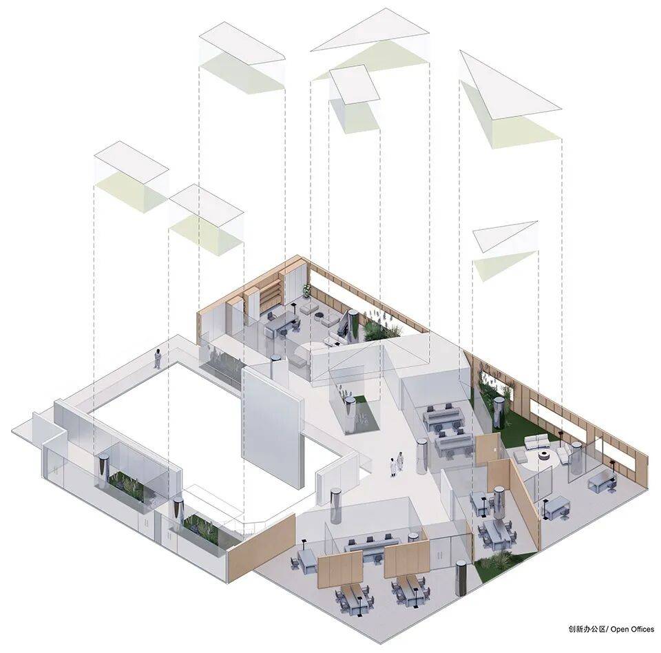 ▲样品库© whyseeimage 创新办公区 软膜照明如星辰般点缀在办公区域上空,其不规则的排布方式与工作台布局形成有趣的重叠。而布置了绿植的玻璃盒子,正好成为开放办公区域与区域之间的视觉节点。这种设计鼓励着自发的交流、跨领域的碰撞和多层次的对话,让创新在空间中自由流动。