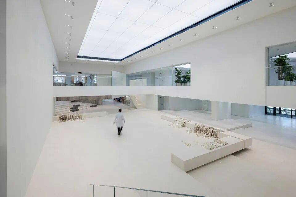 ▲开放式讨论环境© whyseeimage 多功能中庭 宽敞的中央接待空间承载着双重功能。这个通高的空间虽非专门的展厅,但其均匀的照明条件和开阔的场地完全适合举办大型项目展示,目的是营造一个开放的工作和讨论的场景。在这里展示不是目的,而是讨论的工具和信息交流的载体。周边设置的座椅既可供人休憩,也可兼作临时展台。八间不同组别的研发工作室以及其附属的材料库环绕在中庭的一侧,通过开敞讨论区与中庭实现软连接。