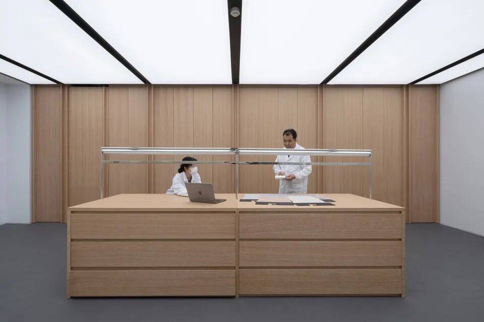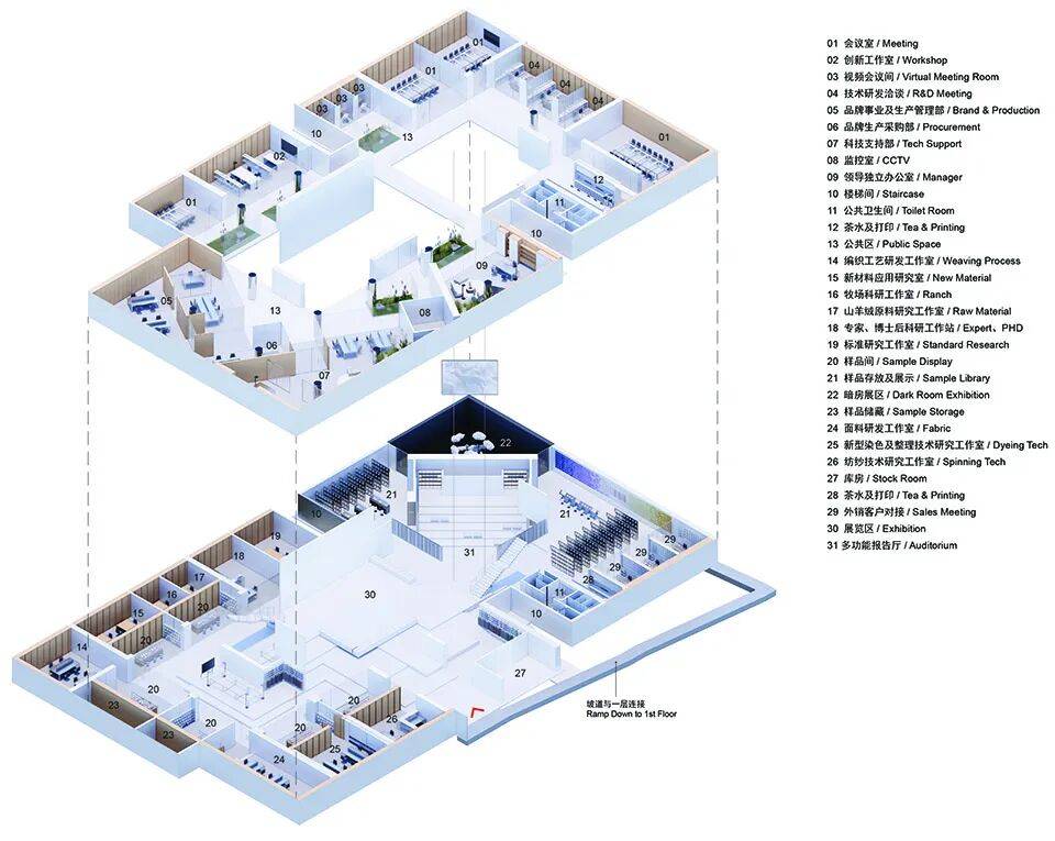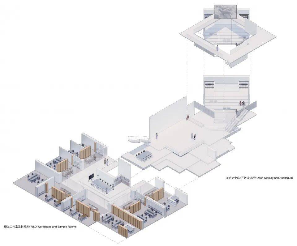 ▲开放而多元的工作环境© whyseeimage 舍弃原始建筑中的中庭用作展示区的传统做法,我们更注重激发研发团队的创新活力。墙面和架上的样品不再是静态的展览品,而是可供随时取用、观摩的互动元素。通过将样品库重新定义为研讨空间,我们让产品研发过程变得更加开放透明。考虑到本地员工的工作习惯,我们将各工作室的样品间设置在面向公共中庭和走道的显眼位置,而将实际办公区安置在样品间后方,既保证了私密性,又让每个工位都能享受自然采光和室外景观。我们将演讲厅设计为与原有建筑网格呈45度角,这一布局强化了与材料库、样品区的空间对话。新建的空中连桥轻盈地跨越中庭,既在物理上分隔了演讲沙龙与主厅功能,又保持了视觉上的连通。新建的连桥上的观景平台更成为促进人们不期而遇的绝佳场所,同时也在物理空间中将演讲厅与中庭做了区域的分割同时又保持了视觉的交互和联系。