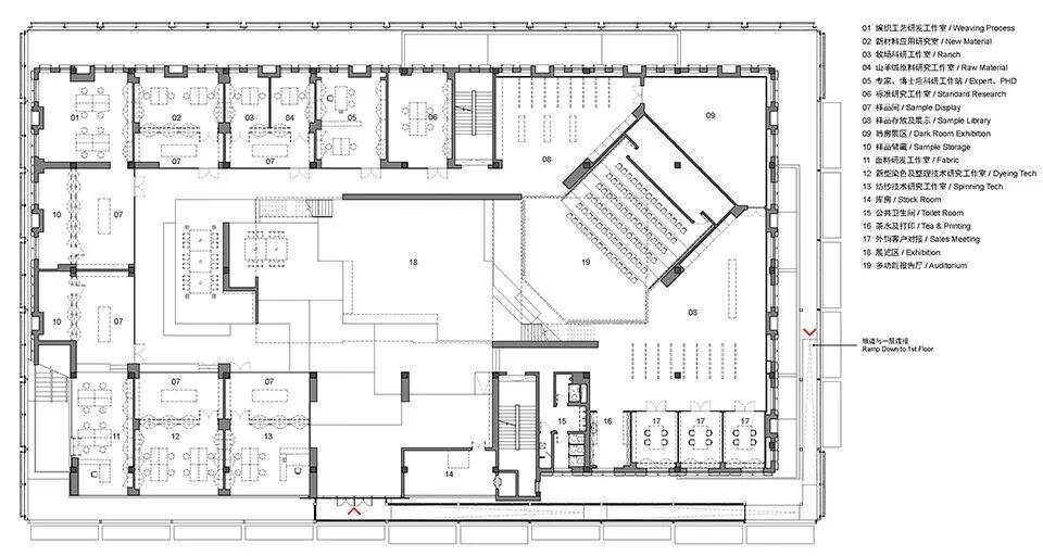 ▲三层平面© waa未觉建筑 项目名称:羊绒技术中心 业主:鄂尔多斯集团 方案设计:waa未觉建筑 施工图设计:waa未觉建筑 设计团队:张迪,杨杰克,冯雨晴, 伍艺文,李坤荣 幕墙顾问:北京博亚工程咨询有限公司 张燕新,汤理达(MaP3) 灯光顾问:悦森照明科技(上海)有限公司 总包施工:西安名冠展示道具有限公司 幕墙施工:北京盈海创建科技发展有限公司 东南九牧(河北)铝业有限公司 摄影/摄像:陈旸/whyseeimage 设计面积:4578平方米 设计周期:2024.10-2025.03 建设时间:2025.03–2025.08 项目地址:内蒙古自治区鄂尔多斯市东胜区罕台镇