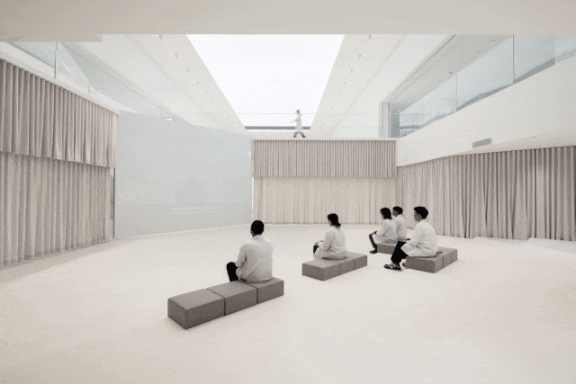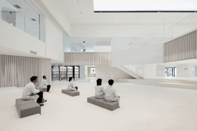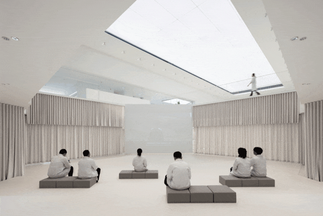▲均匀的照明条件和开阔的场地适合举办大型项目展示© whyseeimage 开敞演讲厅 通过新建的连桥与主楼相连的演讲空间配备可升降的布帘隔断,能够适应从私密沙龙到大型讲座的不同需求。阶梯式座位提供灵活的座位安排,而上层廊道的观景平台让这里发生的活动成为整个空间的视觉焦点。当屏幕降下时,这里立即变身为专业研讨和集体学习的知识场域。