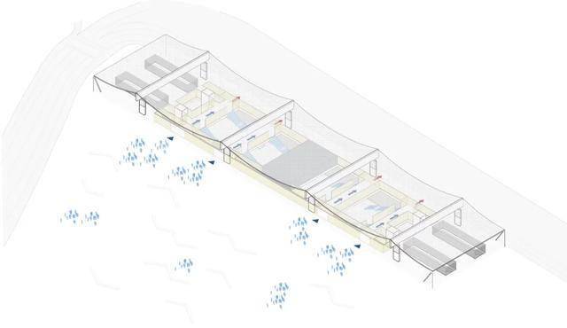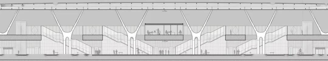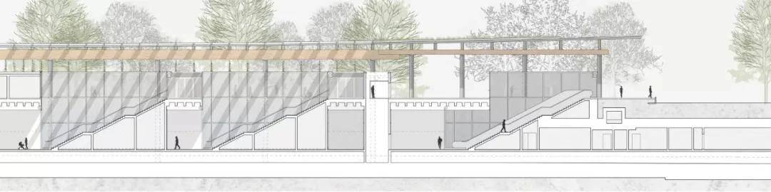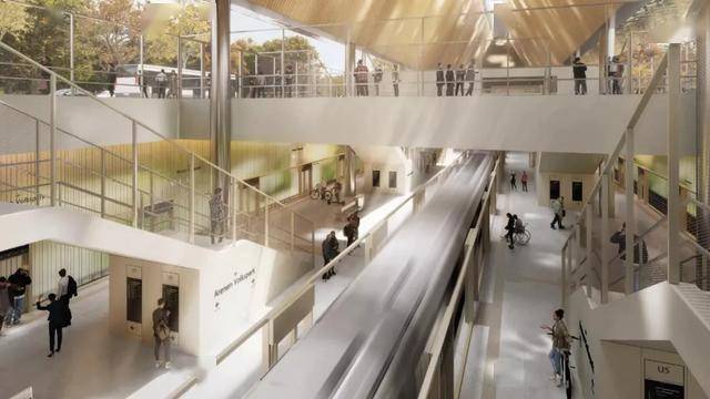 在获胜方案中,地下站台由一个悬挂式木质屋顶覆盖,这个屋顶的特殊造型能够让人们从很远就可以看见,呈现无支撑,光线充足,全玻璃幕墙的印象。blrm 的设计师 Jannes Wurps 说:“这层薄如晶圆的屋顶仿佛漂浮在车站上方,如同一个木制帐篷,框住了周围的景观,并提供了方向指引。”