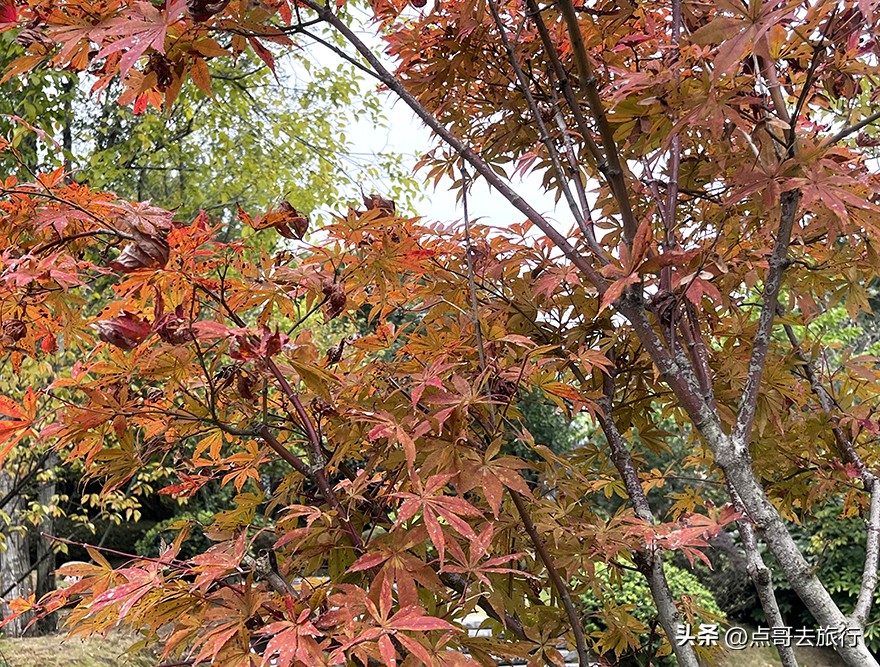 与卧波桥相连,还有一座石拱桥,这里是赏枫叶的不错点位。站在桥的最高处,红枫沿湖岸蜿蜒成景。近处的枫林如火如荼,中层的灌木枫呈现金红相间的斑斓,远处的银杏则点缀着翠绿与鹅黄,整个红枫海就像一幅流动的油画,随着视野的变化不断呈现出新的画面。一阵风来,各色树叶随风摇曳,美不胜收!
