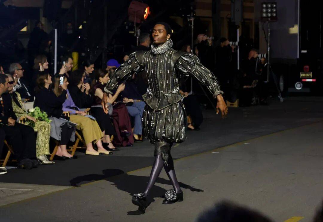 音乐响起,跨性别演员Hunter Schafer 身穿1992年电影《奥兰多》的原创戏服亮相,咬着苹果,踏光而来,复刻蒂尔达·斯文顿的经典角色。
