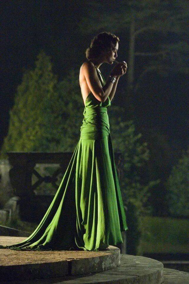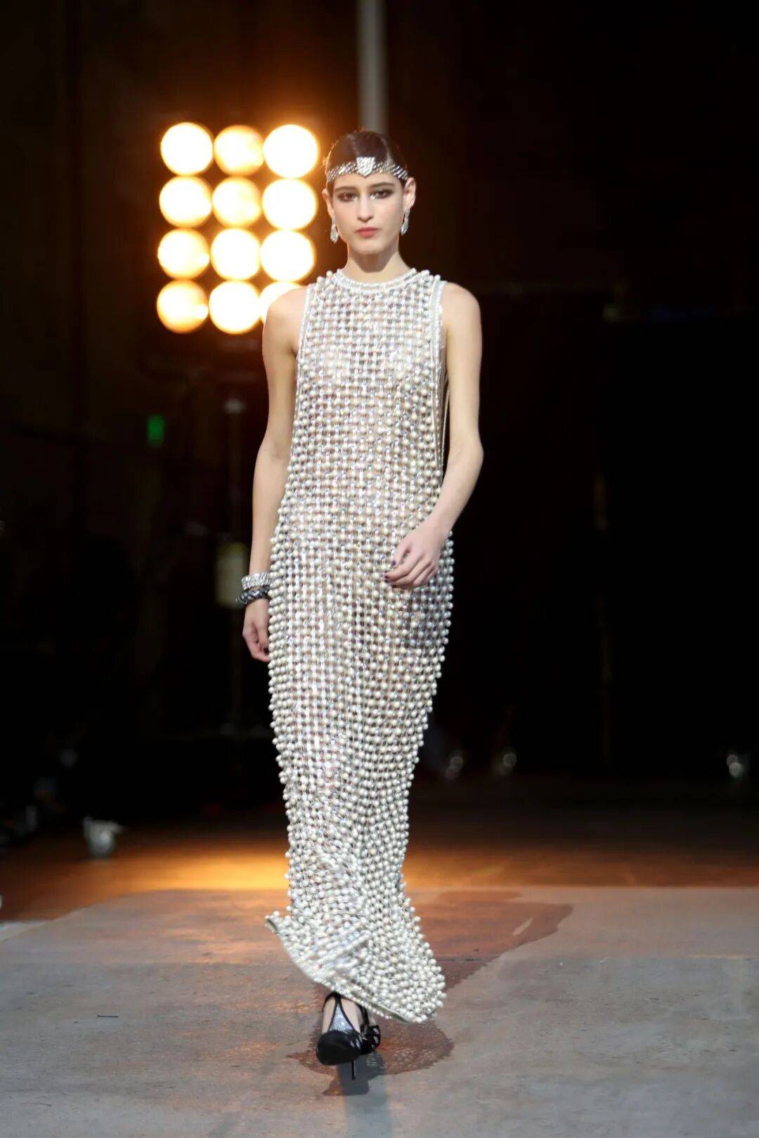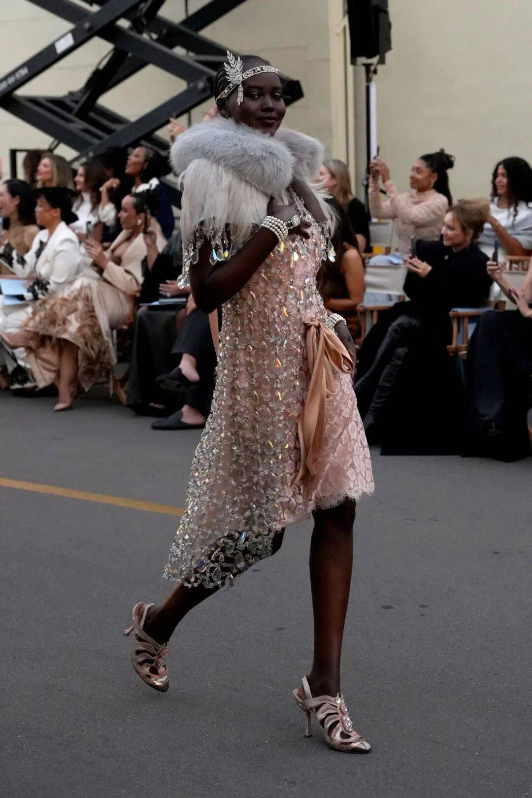 你可以看到《了不起的盖茨比》中Daisy的香槟色礼服再现,水晶闪烁。
