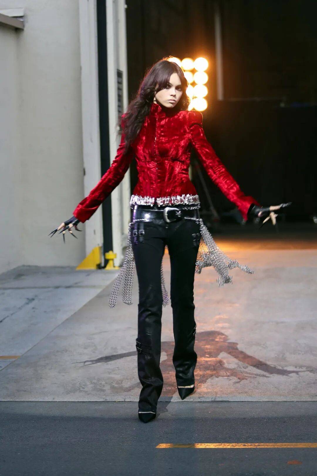 超模Liya身穿着Balmain的皮革拼接裙,走在暗红色灯光中。