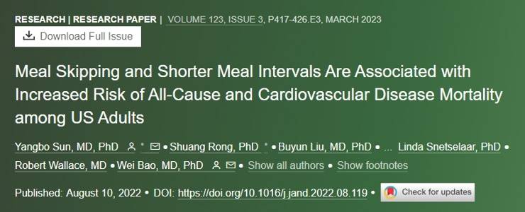 发表在《营养与饮食学会杂志》上的研究发现,一日三餐少了任意一餐都会增加死亡风险。该研究对美国健康与营养检查调查数据库内2.4万余名受试者的数据进行了分析,评估饮食行为与全因死亡率、心血管疾病死亡率之间的相关性。