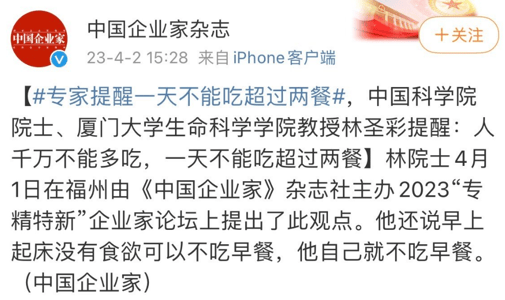相信很多在坚持“减餐法”的中老年人都看过这段视频,中科院院士林圣彩在采访时说没必要一天超过2餐,人需要有一定的饥饿感。在饿的时候产生的生物反应,可促进长寿因子提升。