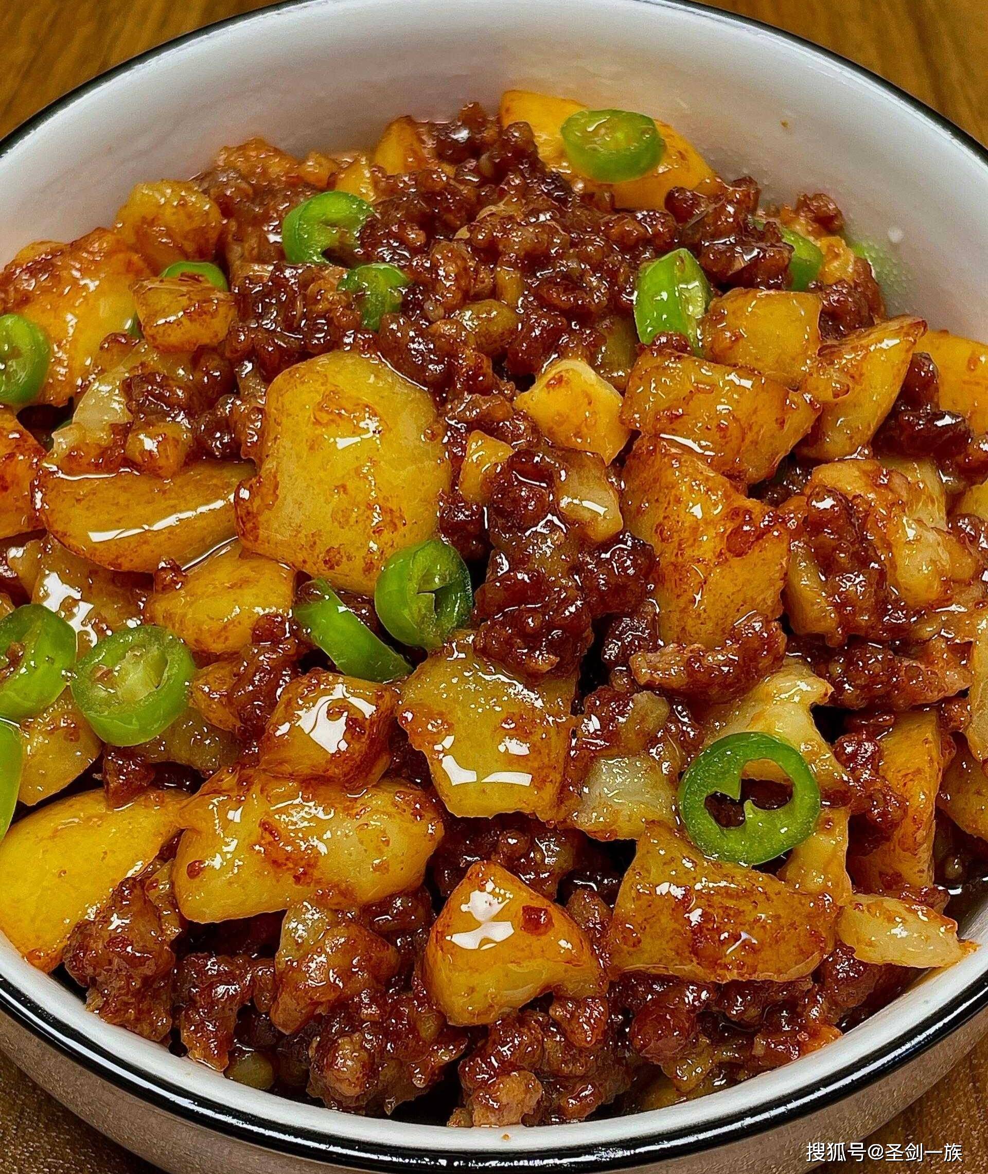 所需食材:猪前腿肉末200 g、黄心土豆2个(约400 g)、蒜末3瓣、小米辣2根、葱花1根、生抽2勺、老抽半勺、蚝油1勺、糖半勺、料酒1勺、白胡椒粉少许、清水小半碗、食用油2勺。 步骤: 1. 土豆去皮切1 cm小丁,清水淘洗2遍去淀粉,沥干备用;肉末加料酒、白胡椒粉抓匀腌5分钟。 2. 热锅冷油1勺,下土豆丁中火煎至边缘微焦金黄,盛出待用。 3. 同锅再加1勺油,放蒜末、小米辣圈爆香,倒入肉末快速划散,炒至变色出油。 4. 把煎香的土豆倒回锅中,与肉末混合,沿锅边淋生抽、老抽,翻匀上色。 5. 加蚝油、糖,倒入小半碗清水,盖上锅盖,转中小火焖4分钟,让土豆吸足肉汁。 6. 开盖转大火收汁,汤汁浓稠后尝味,缺盐补少许生抽,撒一把葱花翻匀。 7. 关火焖30秒让葱香渗透,出锅装盘,汤汁裹满土豆,肉香四溢。 八、麻婆豆腐