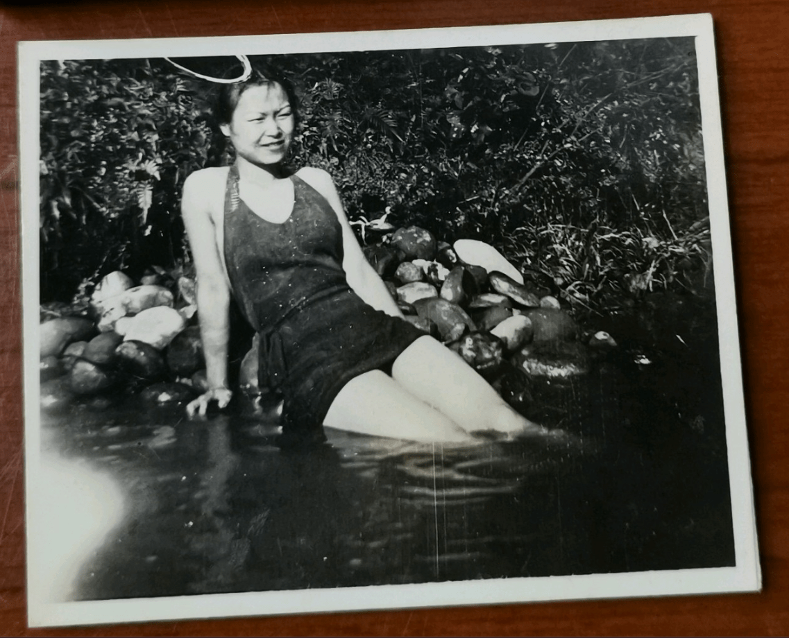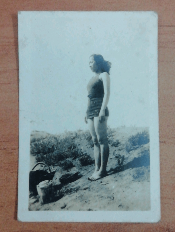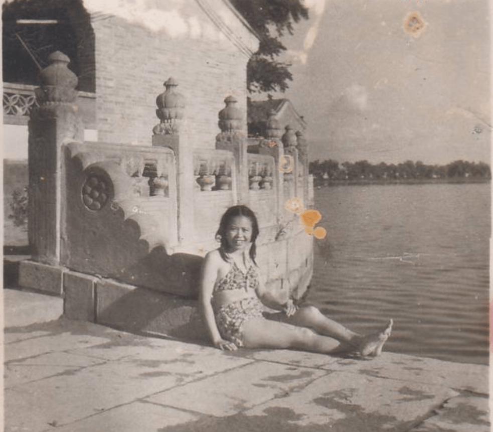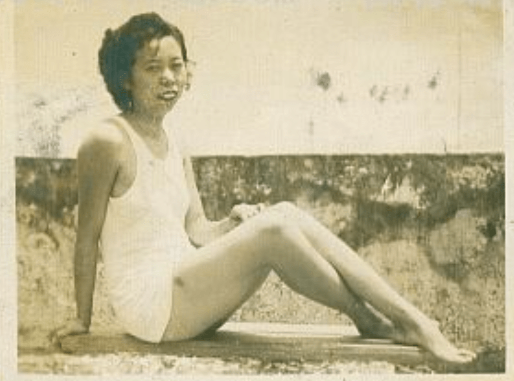 这是一张1938年的老照片,照片中的女孩穿着泳装,露出修长的双腿。照片背面写着:全恒、钰恒二位惠存,汪淑卿敬赠,1938年10月19日。这表明照片是汪淑卿送给朋友的。从那时就敢拍摄如此大胆的泳装照,可见她的思想超前,勇于挑战当时的传统观念。