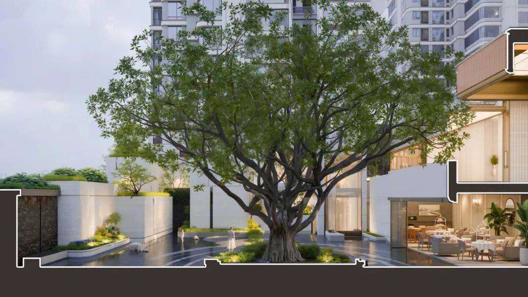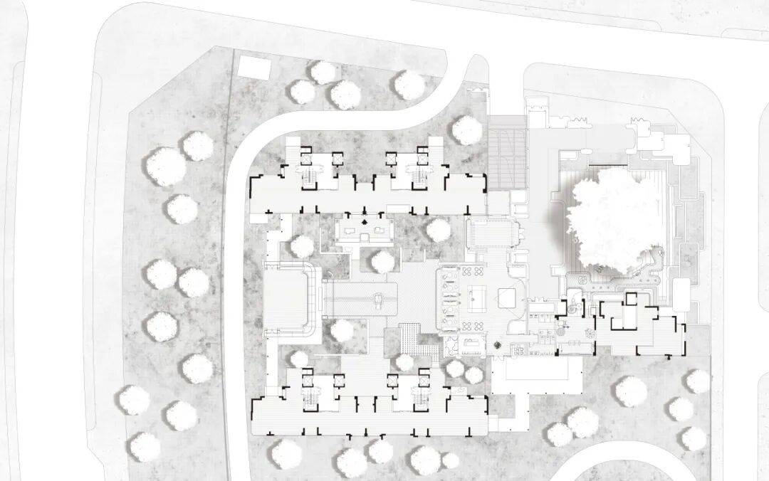 归家走廊实景图 ©IN-FIELD studio 东侧街道通过降低花池高度,弱化界面,让城市行人也能看到榕树,使其成为社区与街区共享的视觉焦点。西侧设置榕树观景台,从侧向展开树冠的层次,使居民可以在不同高度、不同角度阅读这棵树。 进入地下一层院落, 约28米纵深庭院中央的大榕树成为空间焦点,立面带来震撼感的同时保持着整体的通透感。下午茶室围绕榕树静谧而悠闲,光影在树荫下流动。8米通高的儿童会所区与榕树相对,广阔的空间让活力与宁静交织,创造出独特的空间体验。