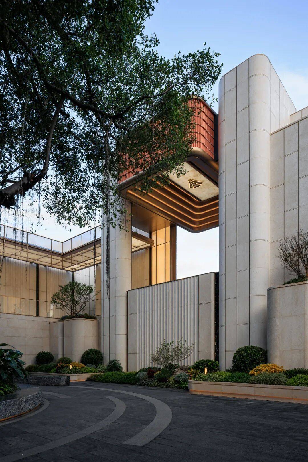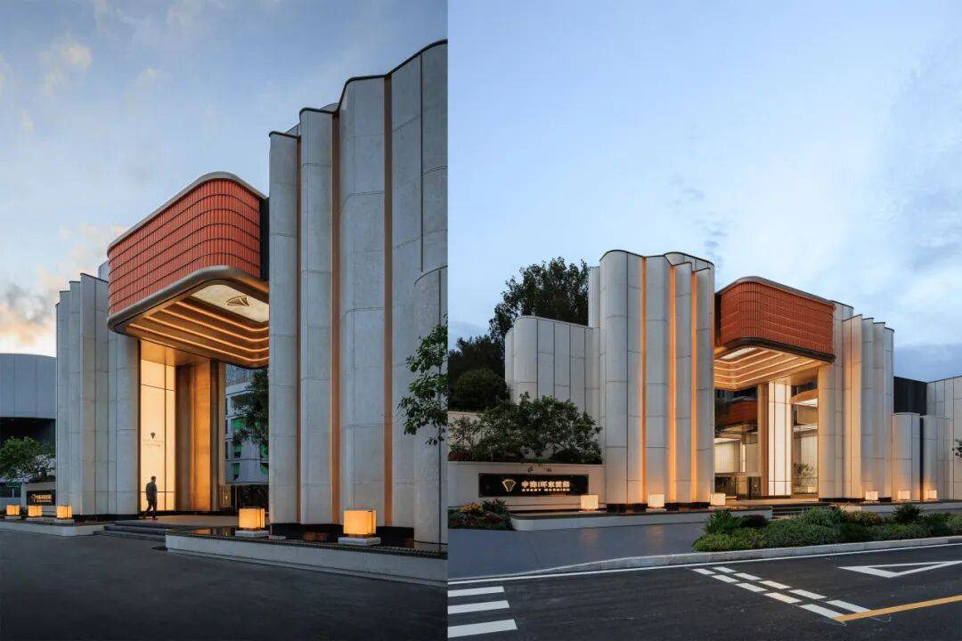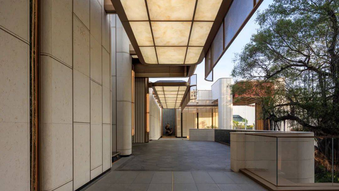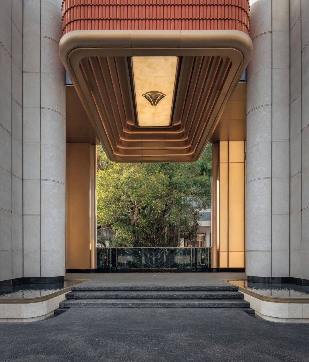 北立面实景图 ©IN-FIELD studio 步入4米宽的归家走廊,外侧可以看到百年榕树与榕树广场的盎然绿意,静谧自然的氛围扑面而来。内侧以透光石材吊顶与装饰墙面营造奢雅质感。回望10米高的门头,空间的序列感与仪式感相互交织,构筑出温馨而尊贵的归家体验。