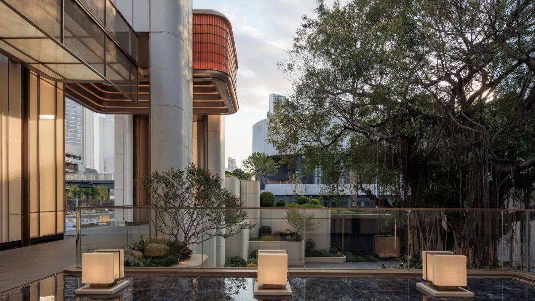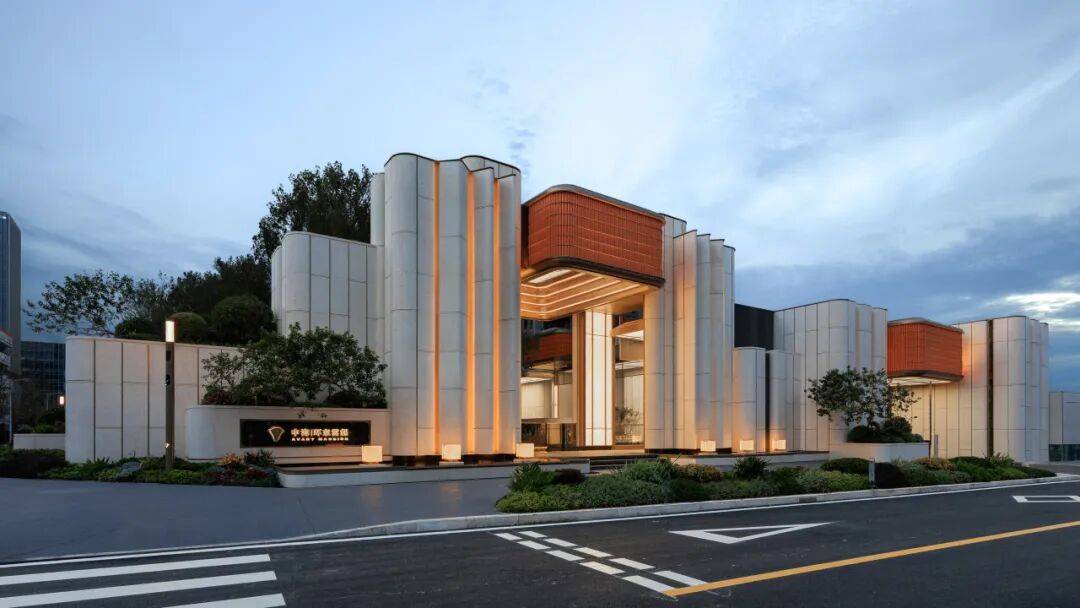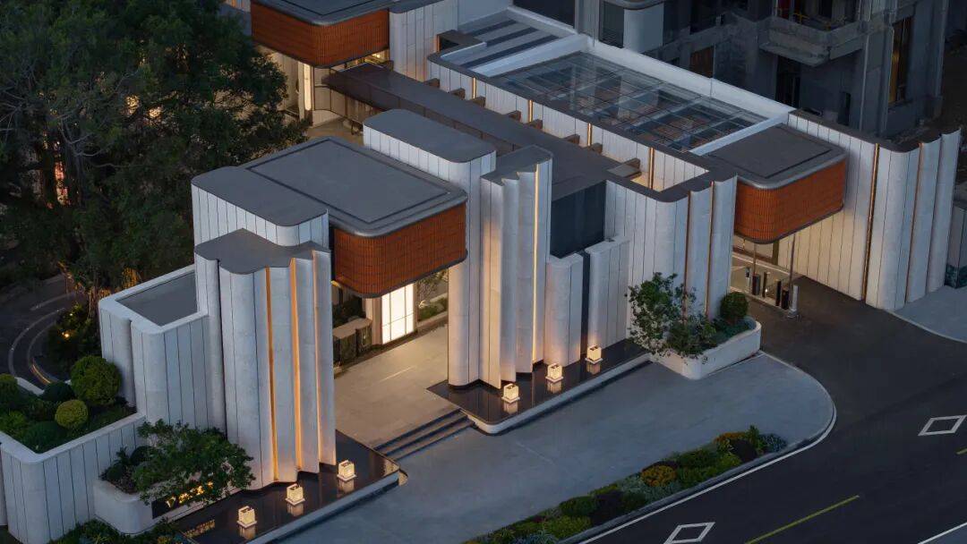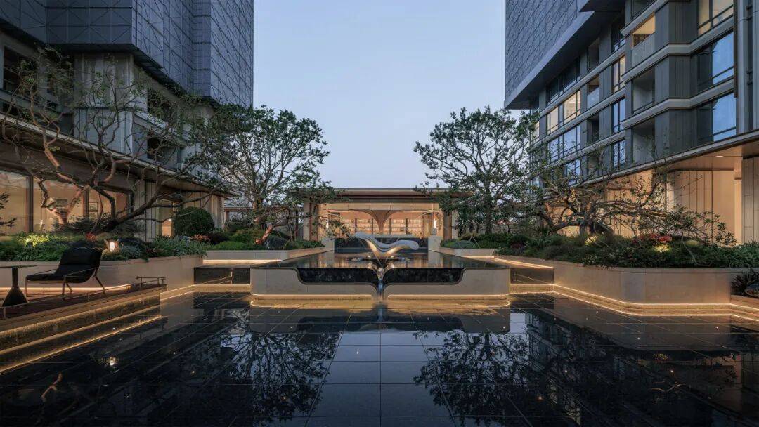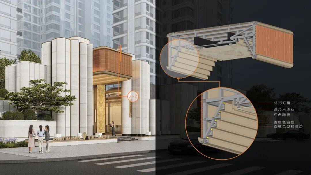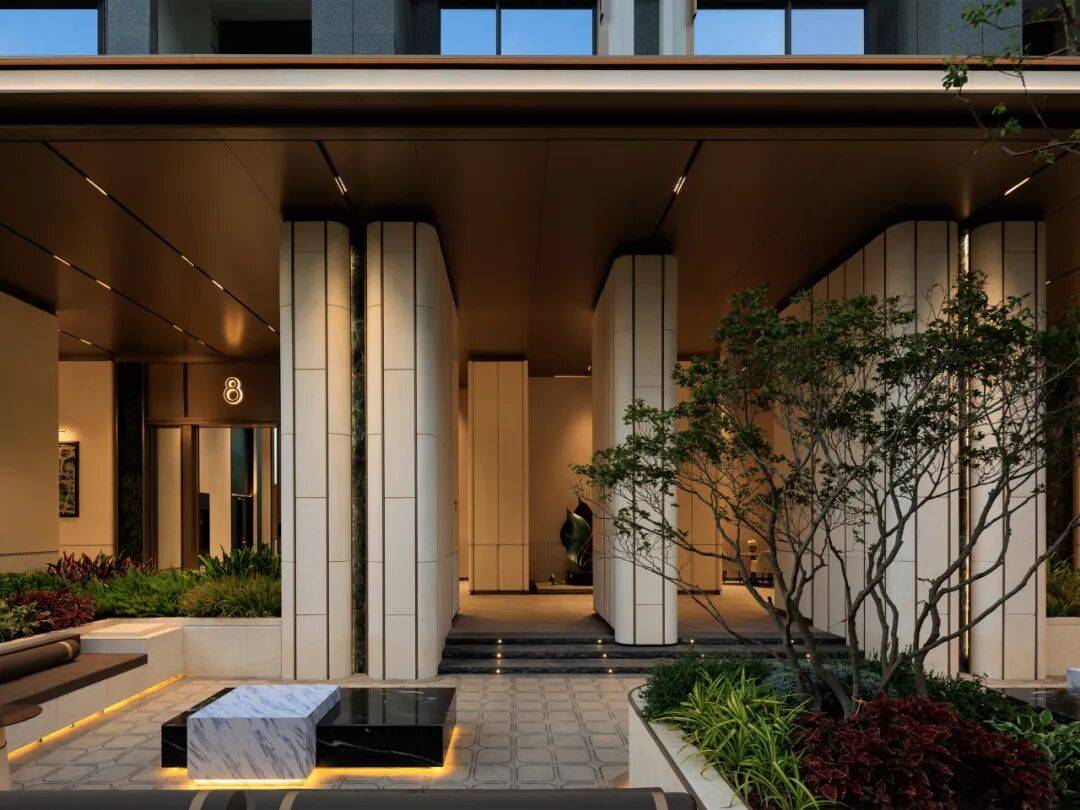 北立面实景图 ©IN-FIELD studio 步入4米宽的归家走廊,外侧可以看到百年榕树与榕树广场的盎然绿意,静谧自然的氛围扑面而来。内侧以透光石材吊顶与装饰墙面营造奢雅质感。回望10米高的门头,空间的序列感与仪式感相互交织,构筑出温馨而尊贵的归家体验。