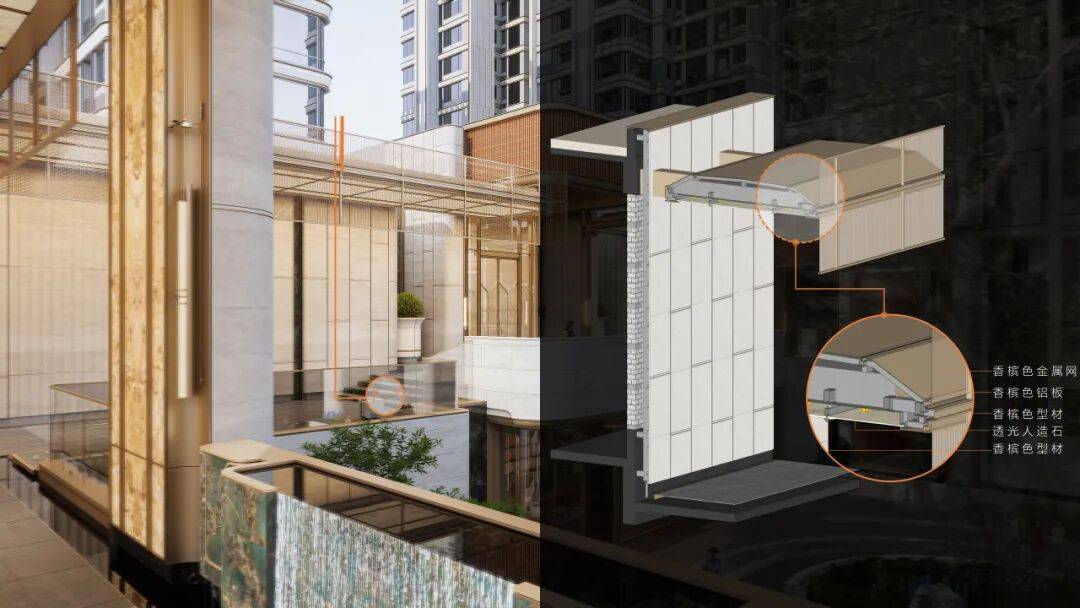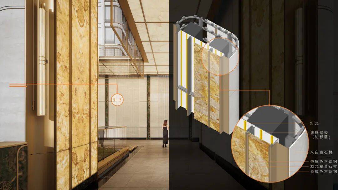 材料与节点分析 ©ZEN 走廊吊顶透光石材具有独特的透光效果,还具有出色的实用性能。它具有较高的强度和耐磨性,可以在长时间使用中保持材质的稳定性和美观性,也能够在不同的环境中保持材料的品质和优雅。