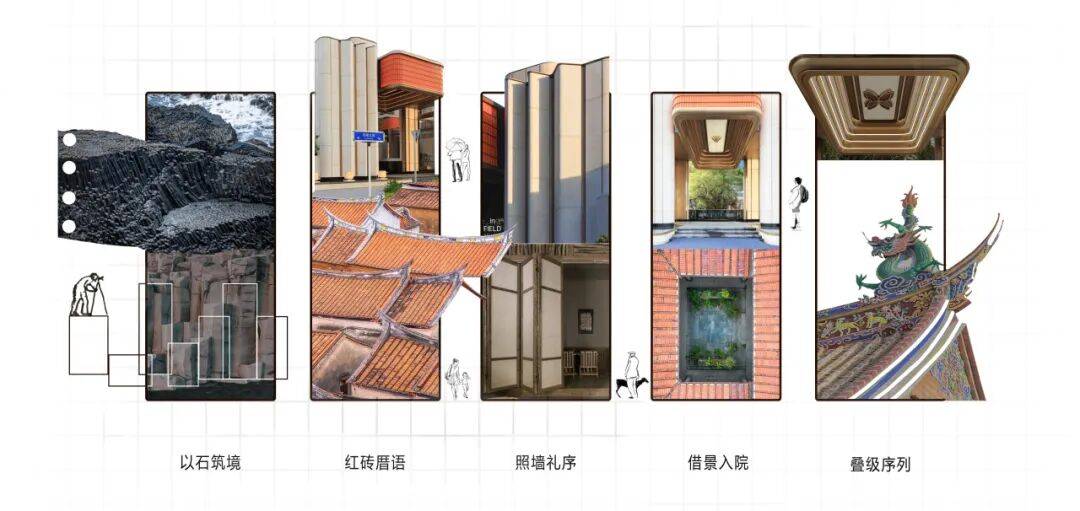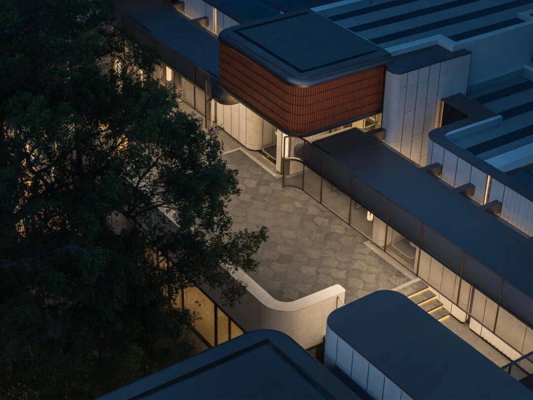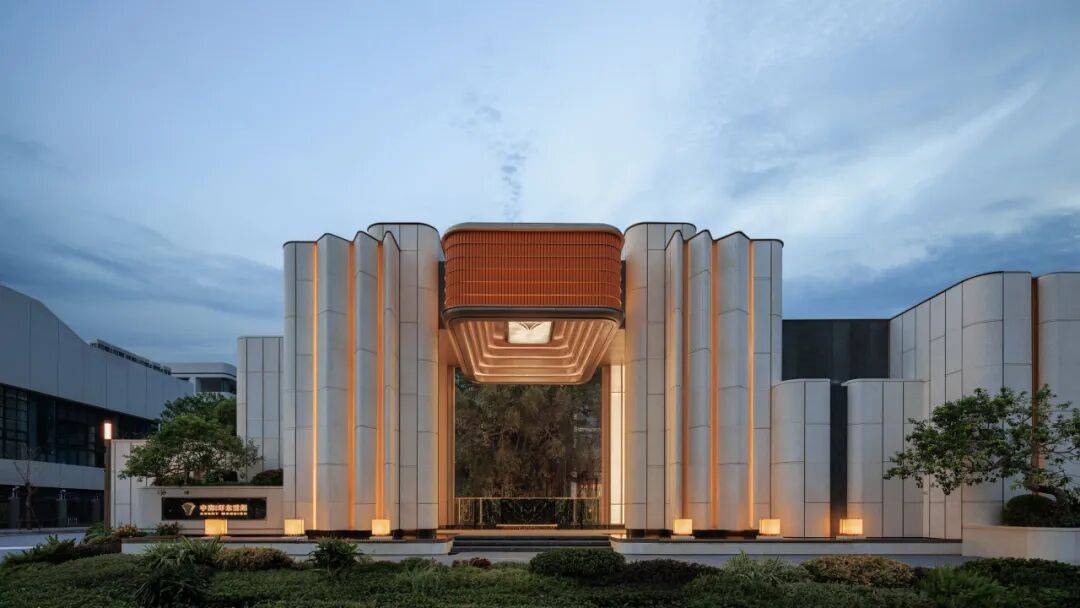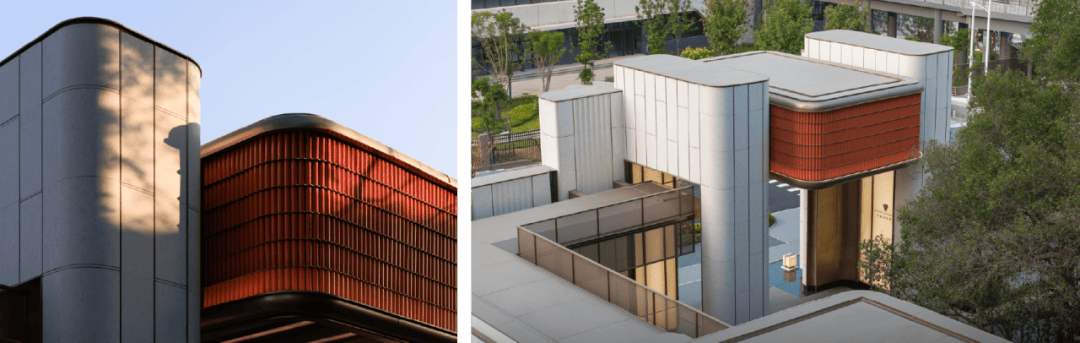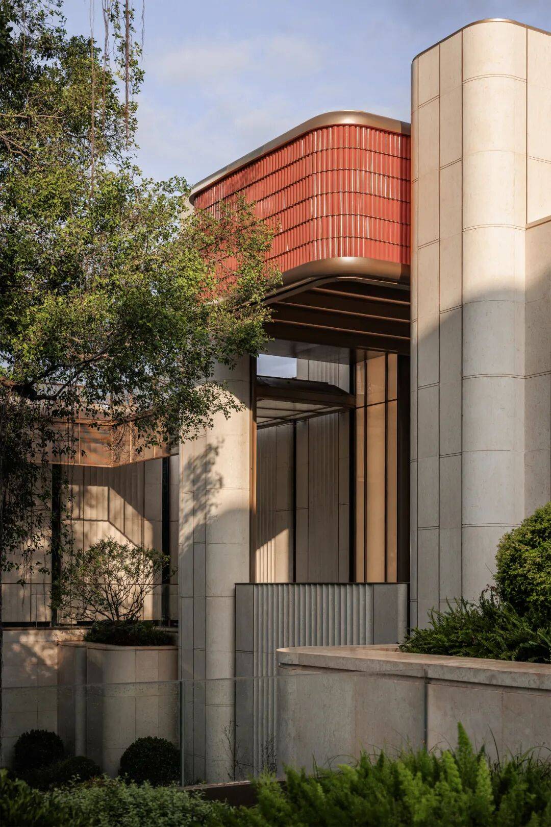 ▲艺术柱廊实景图©IN-FIELD studio 03. 出砖入石之间 延续闽南的底色 自然最能传递温度,古树的岁月自有山石作伴 建筑的立面设计语言,灵感来自海岸边层叠的礁石。 错落堆叠的体量,重现了潮汐冲刷出的起伏节奏,横向延展的肌理与米白色石材反弧面阵列的运用,让建筑在光影中呈现出一种介于厚重与轻盈之间的独特气质。